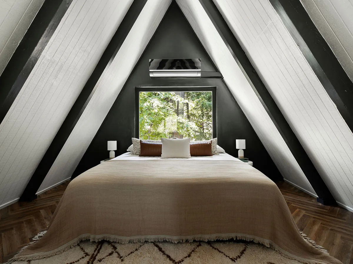 Черные акценты и красный камин: А-образный домик в лесу