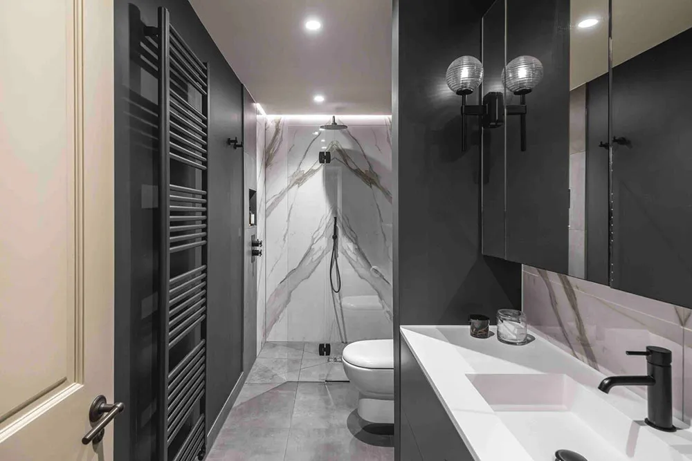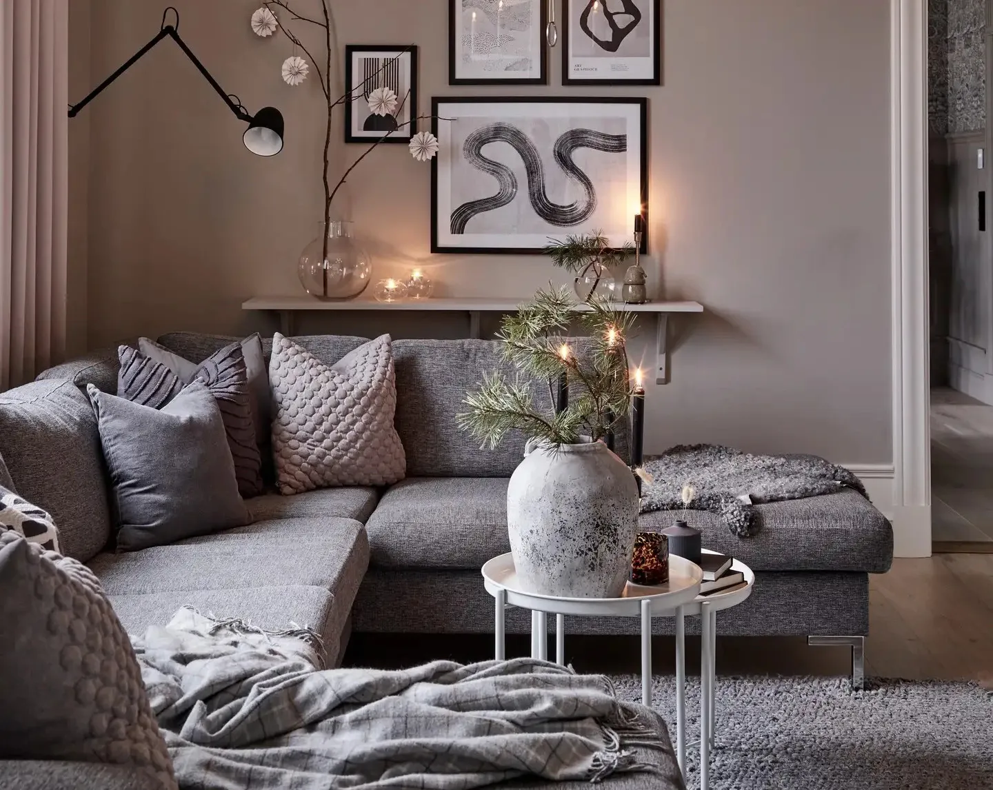 Белая скандинавская квартира с тёмным диваном (79 кв. м)