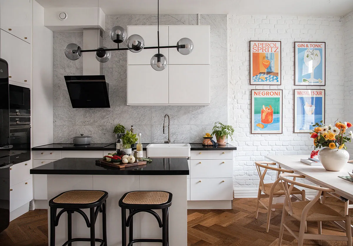 Яркие постеры в дизайне квартиры с лепниной в Стокгольме (82 кв. м)