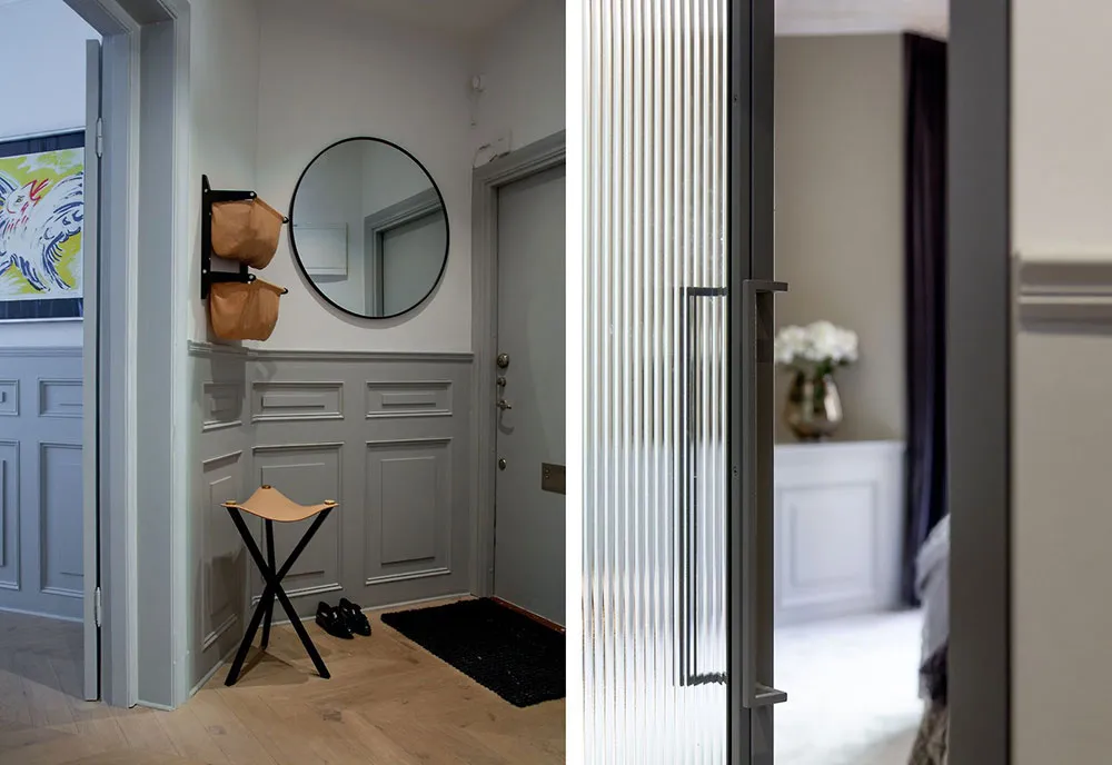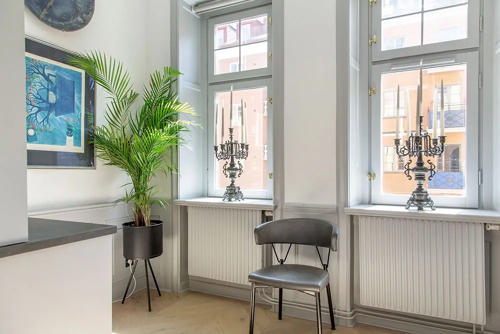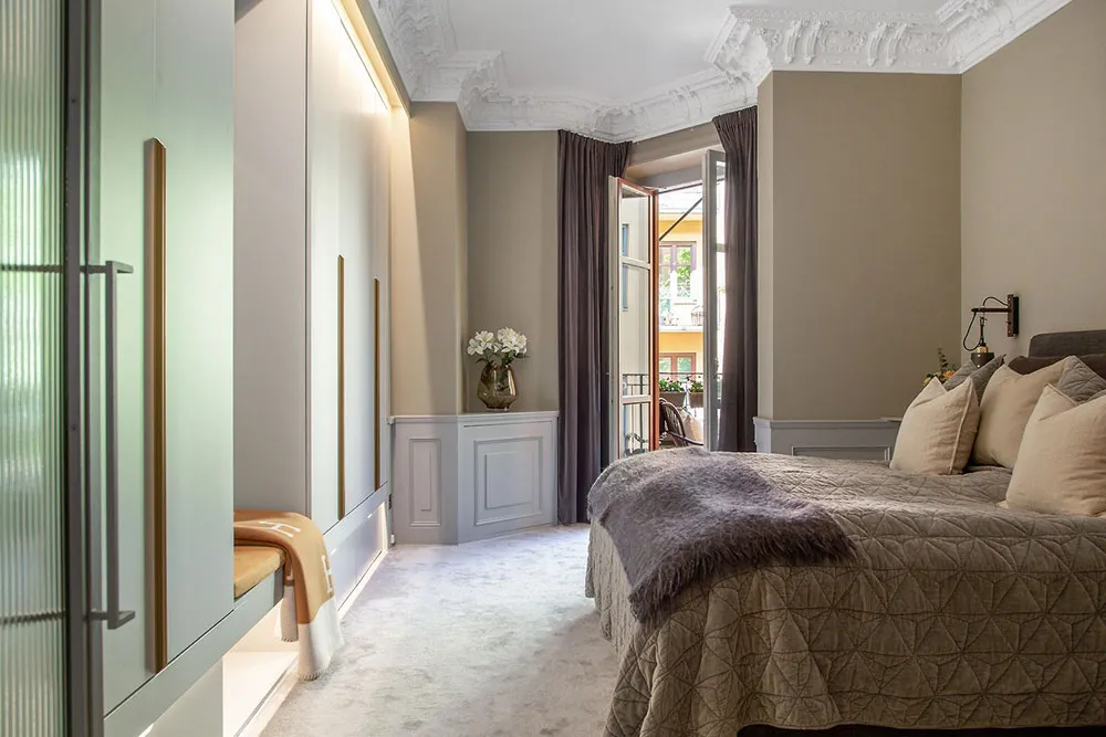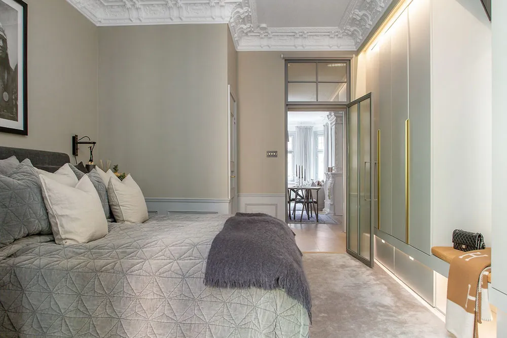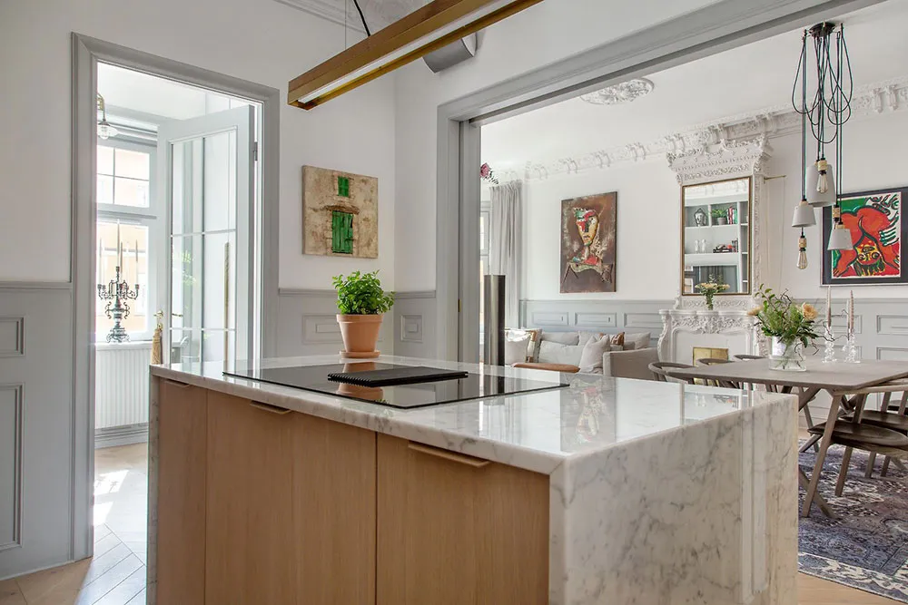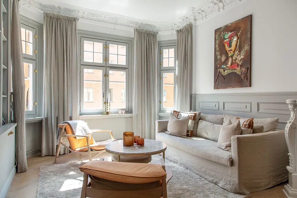 В этой шведской квартире очень много классических архитектурных деталей, они массивные и очень заметные: панели на пол стены, изощрённая лепнина, дверные порталы, классический камин.