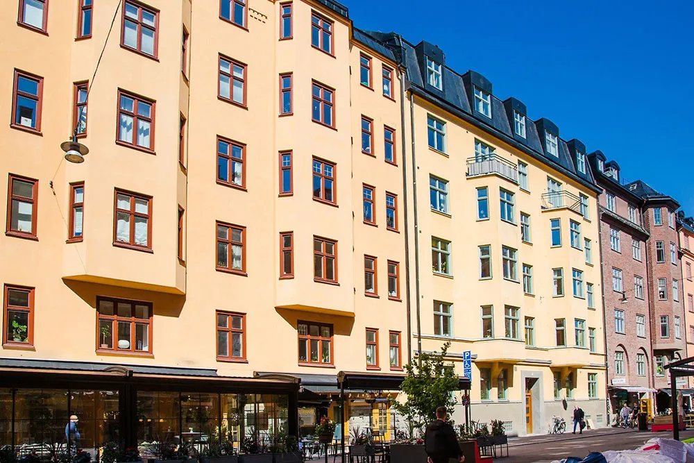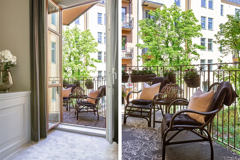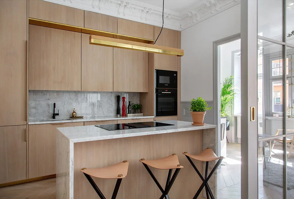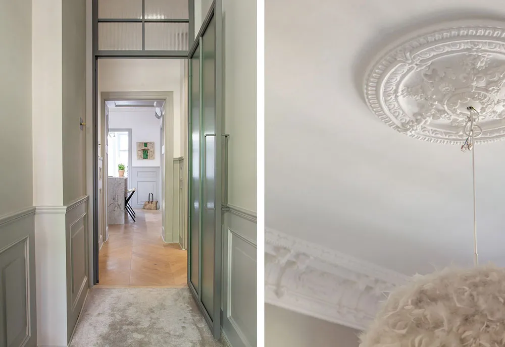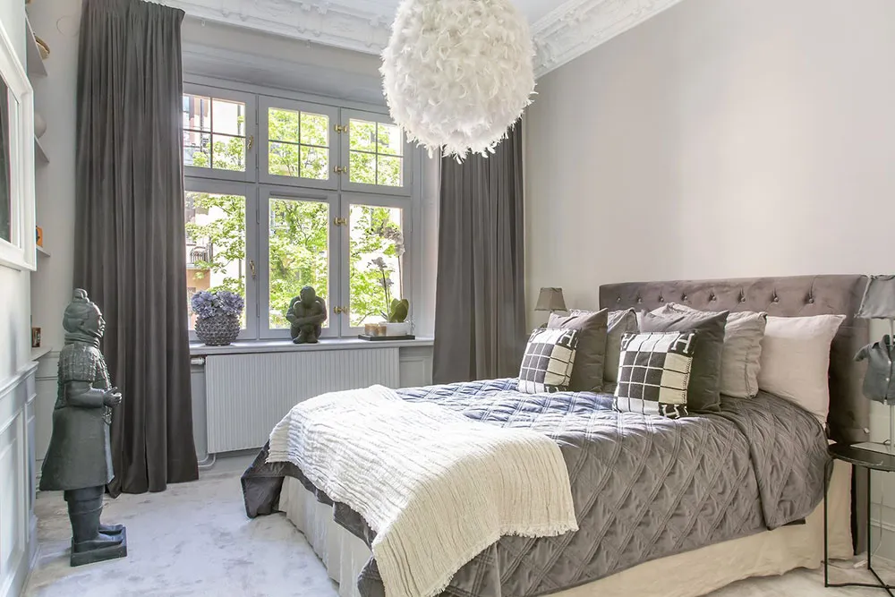 В этой шведской квартире очень много классических архитектурных деталей, они массивные и очень заметные: панели на пол стены, изощрённая лепнина, дверные порталы, классический камин.