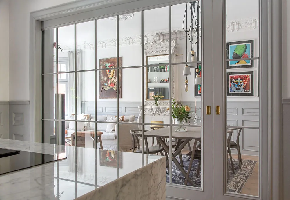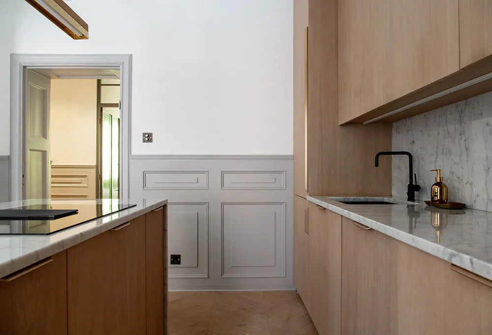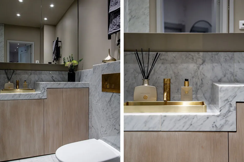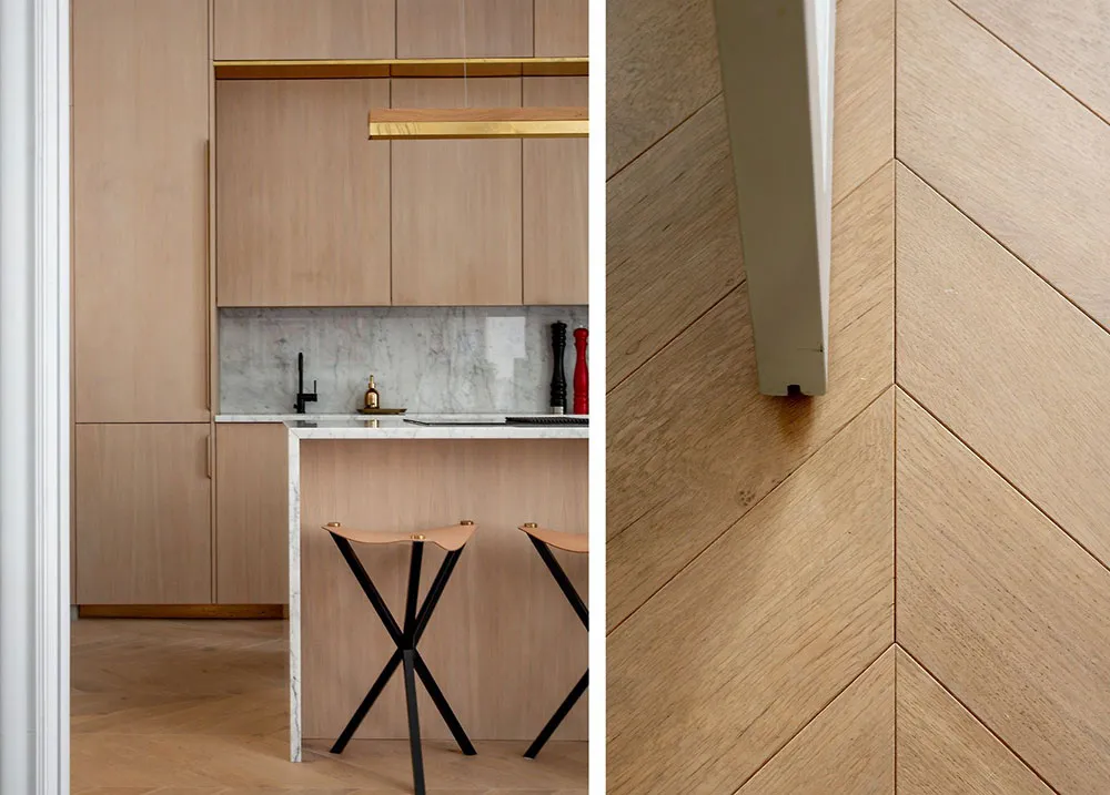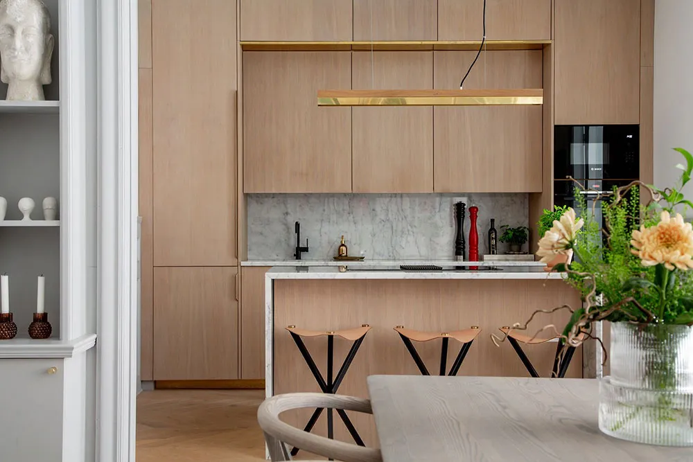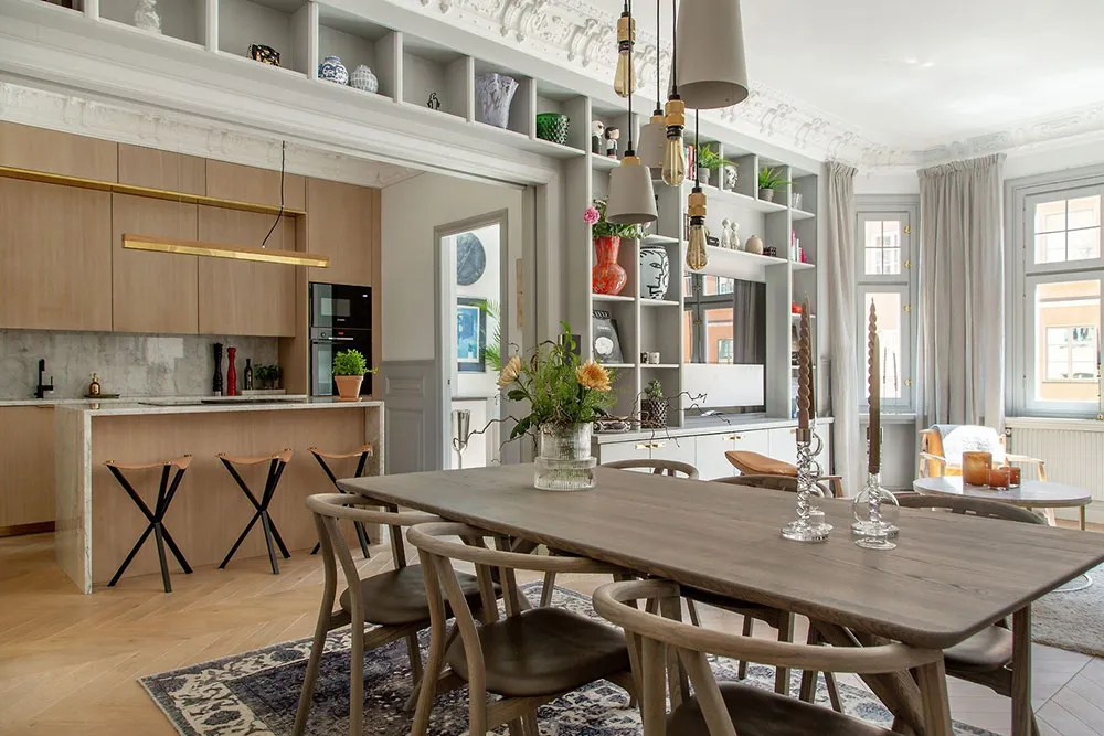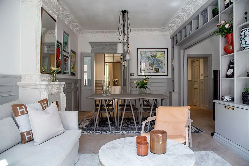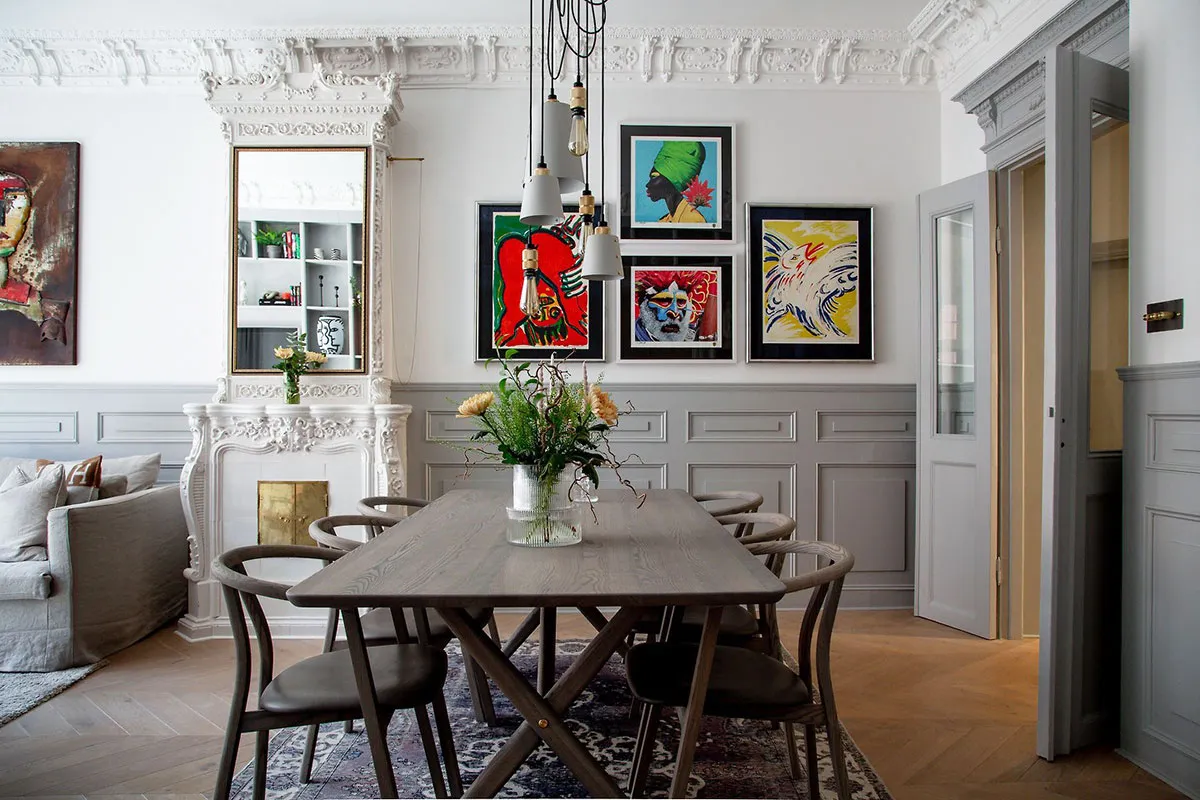 Современная скандинавская квартира с обильным классическим декором
