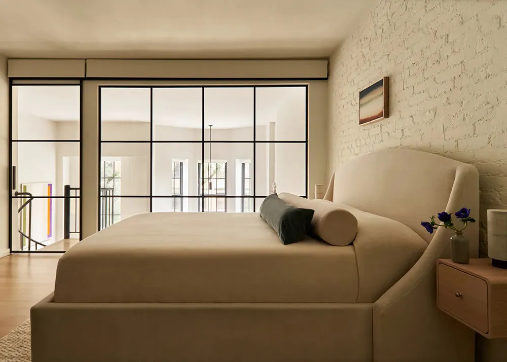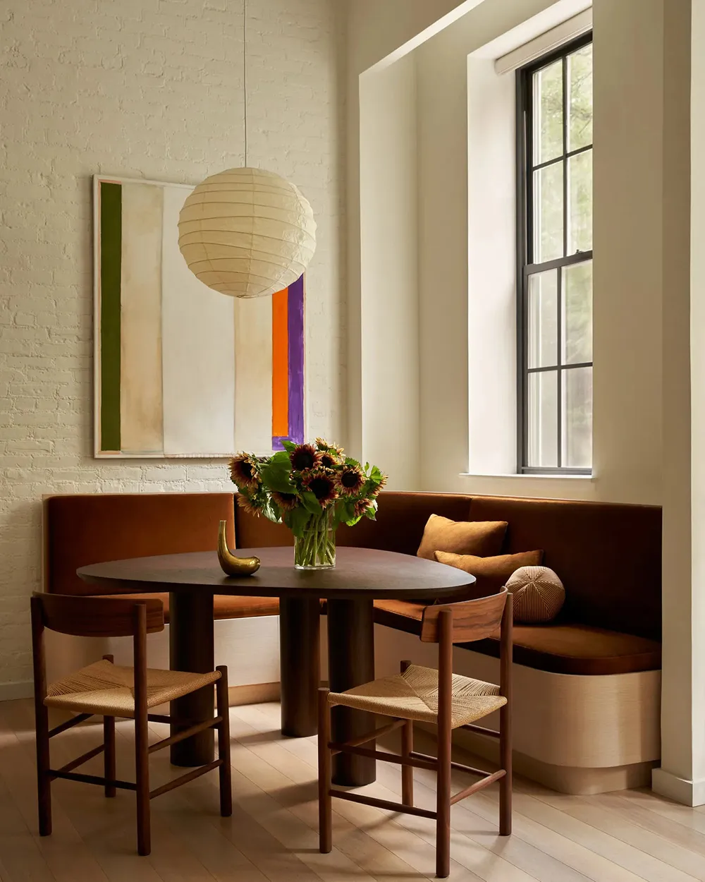 Эркер с красивыми окнами, кирпичная кладка на стенах, мебель в стиле mid-century и вид на таунхаусы из красного кирпича — в этом интерьере чувствуется настроение Нью-Йорка.