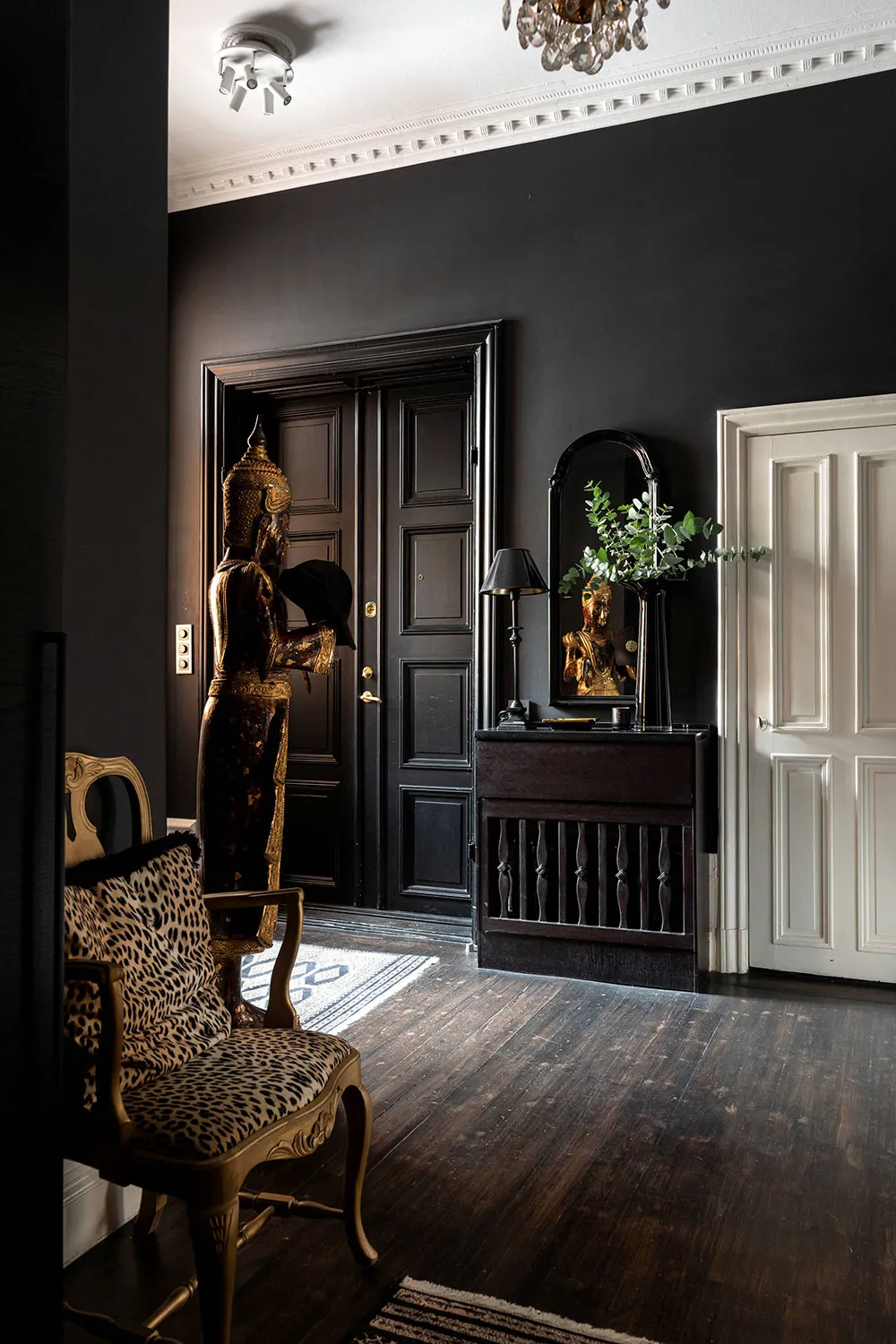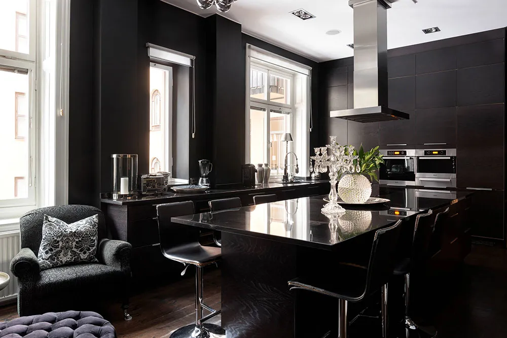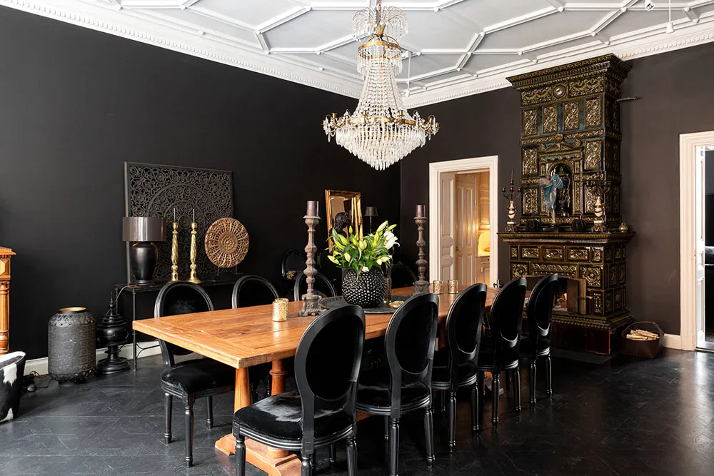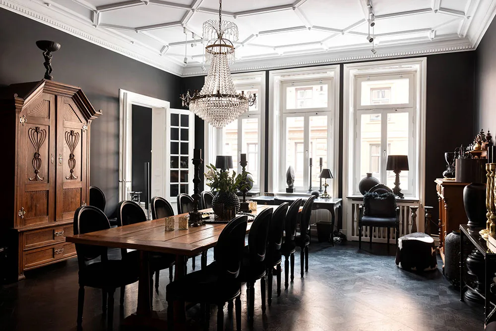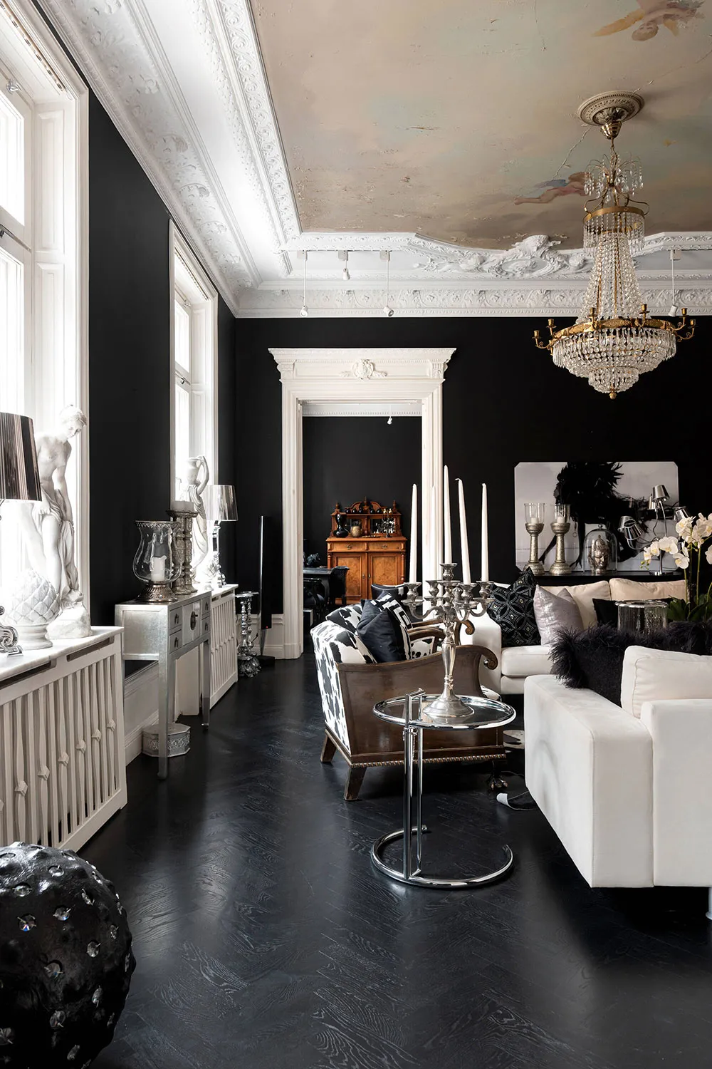 Шведские дизайнеры решили сделать классический интерьер этой квартиры в Стокгольме более современным и эффектным с помощью очень смелой цветовой гаммы — стены и пол буквально во всех комнатах здесь выкрашены в чёрный цвет.