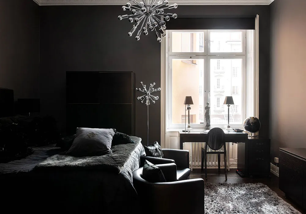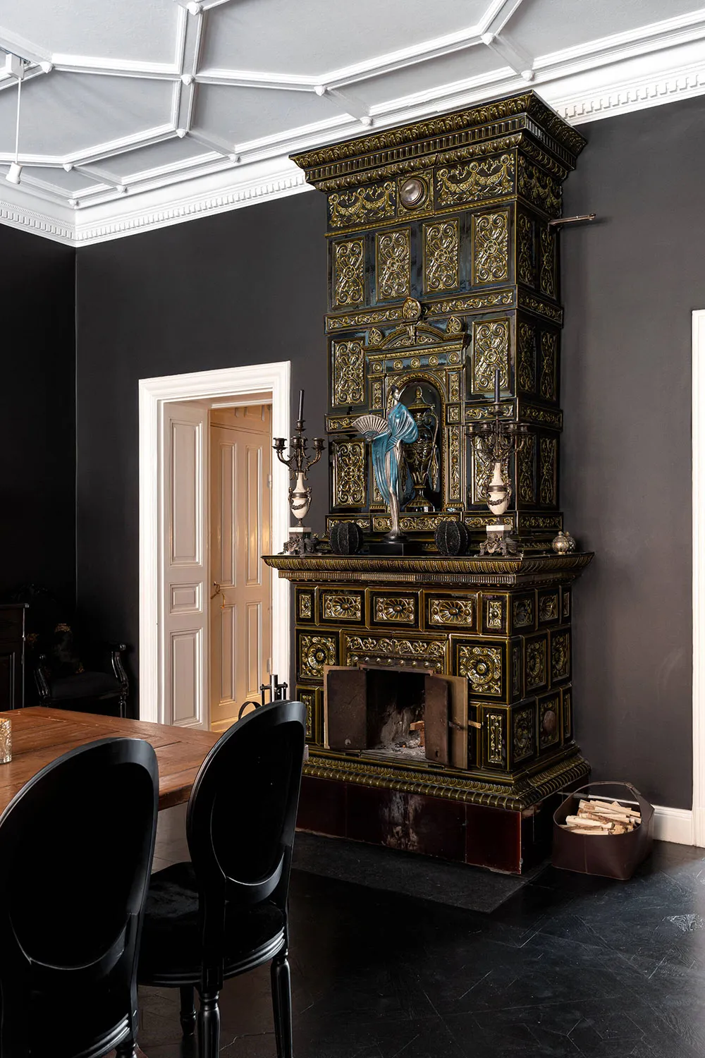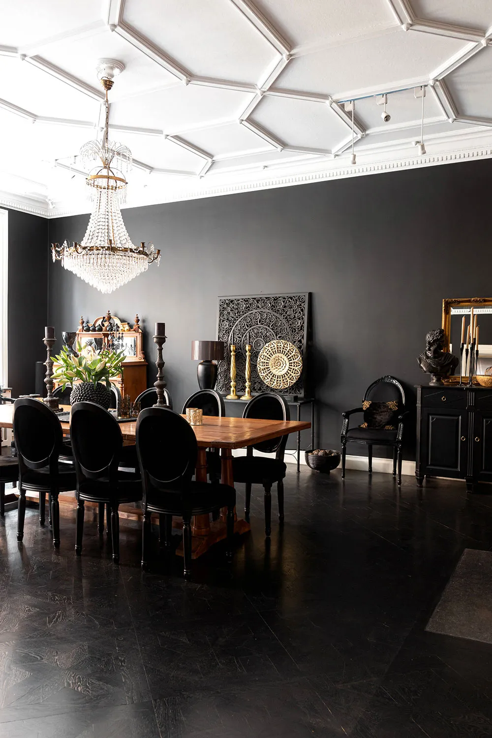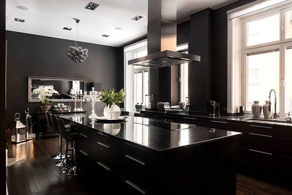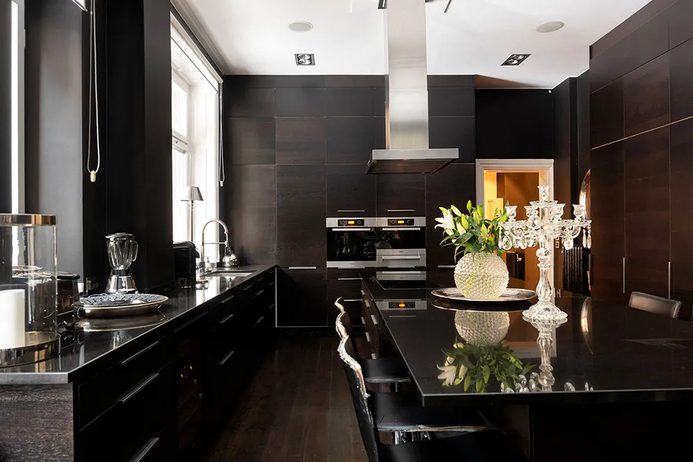 Шведские дизайнеры решили сделать классический интерьер этой квартиры в Стокгольме более современным и эффектным с помощью очень смелой цветовой гаммы — стены и пол буквально во всех комнатах здесь выкрашены в чёрный цвет.