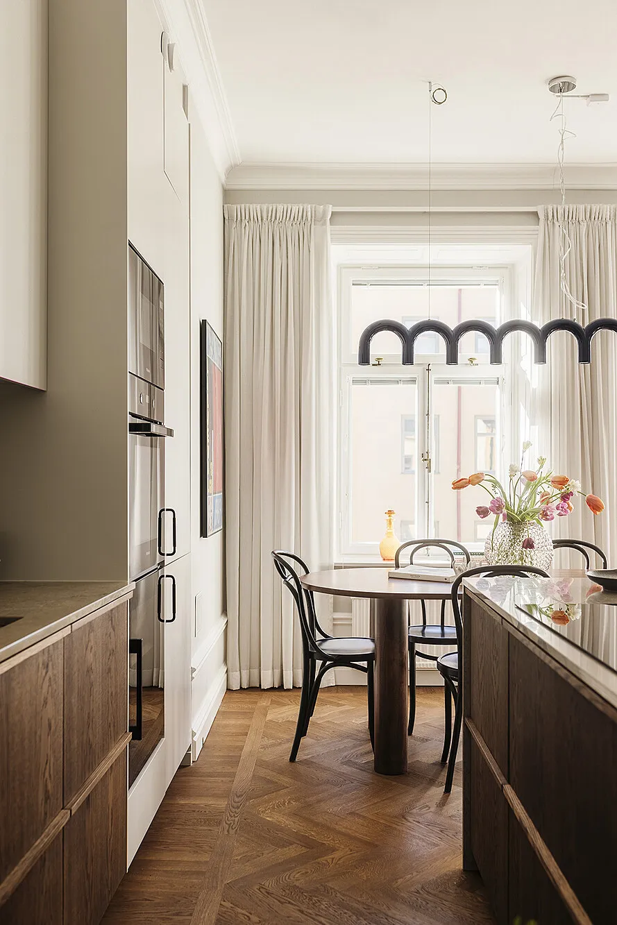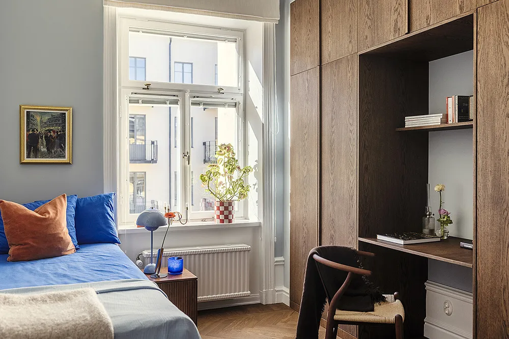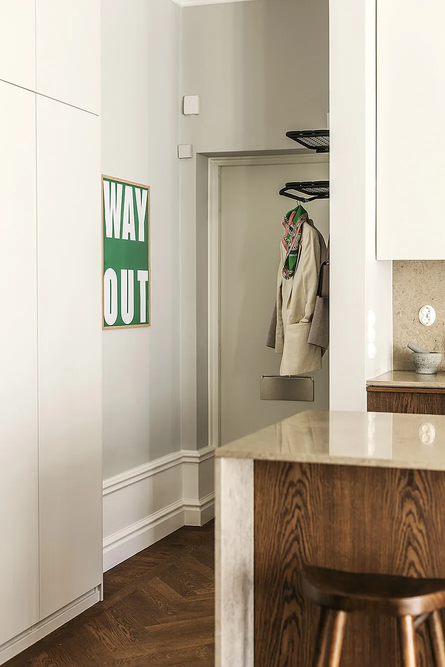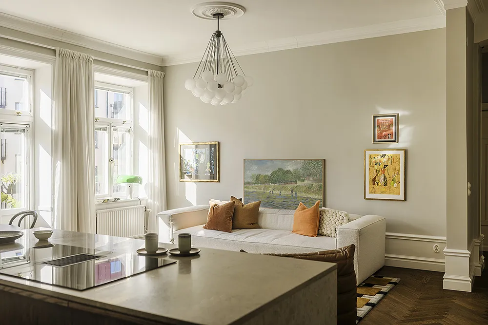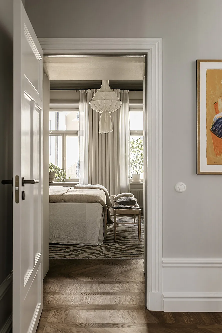 Основа интерьеров этой шведской квартиры довольно простая — тепло-серые стены и тёмный деревянный пол.