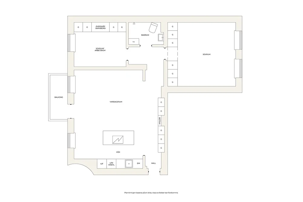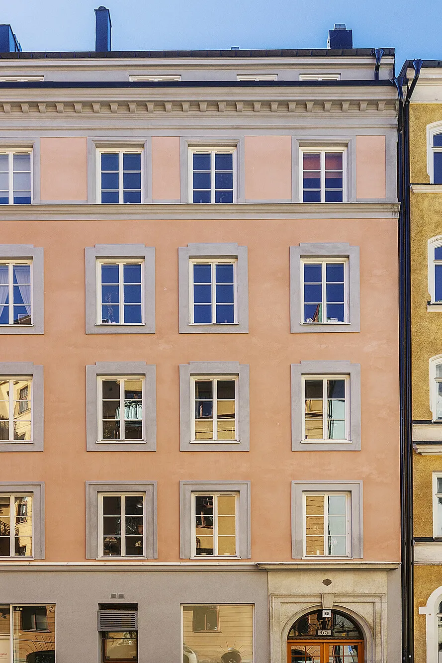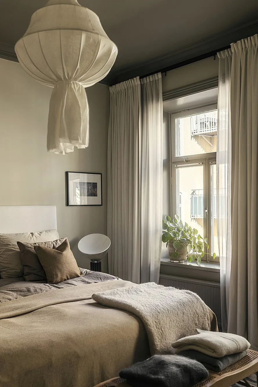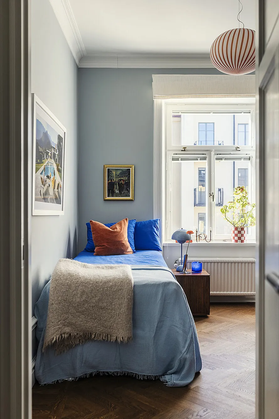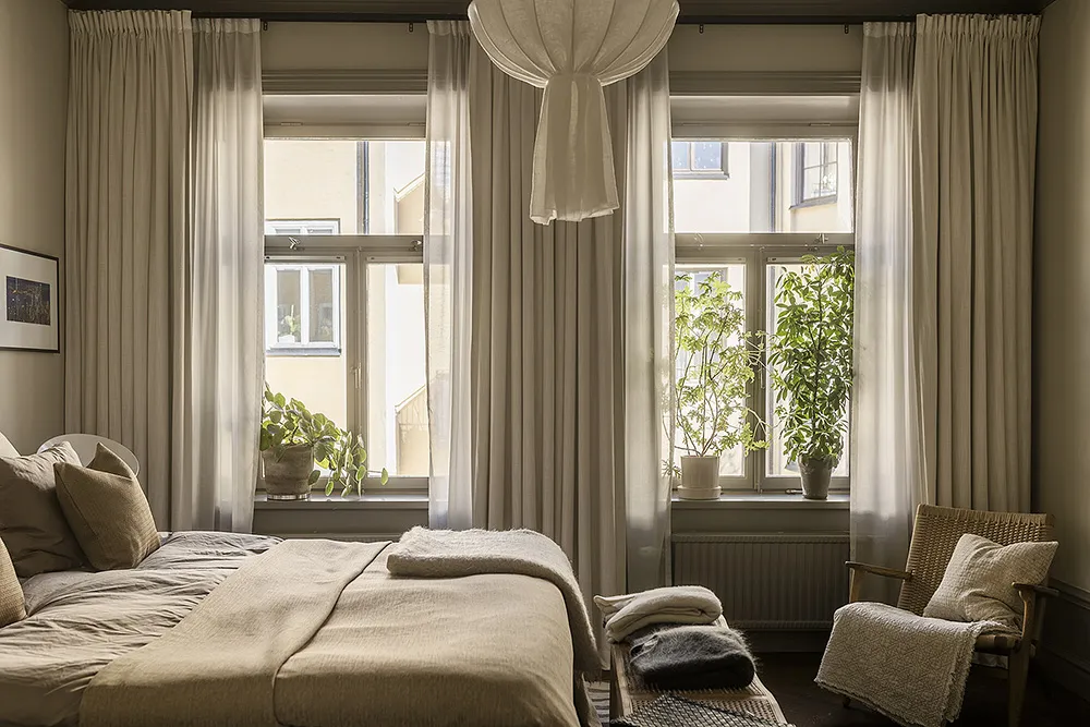 Основа интерьеров этой шведской квартиры довольно простая — тепло-серые стены и тёмный деревянный пол.