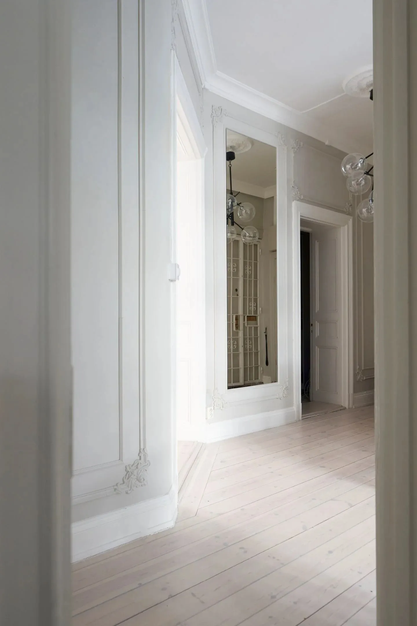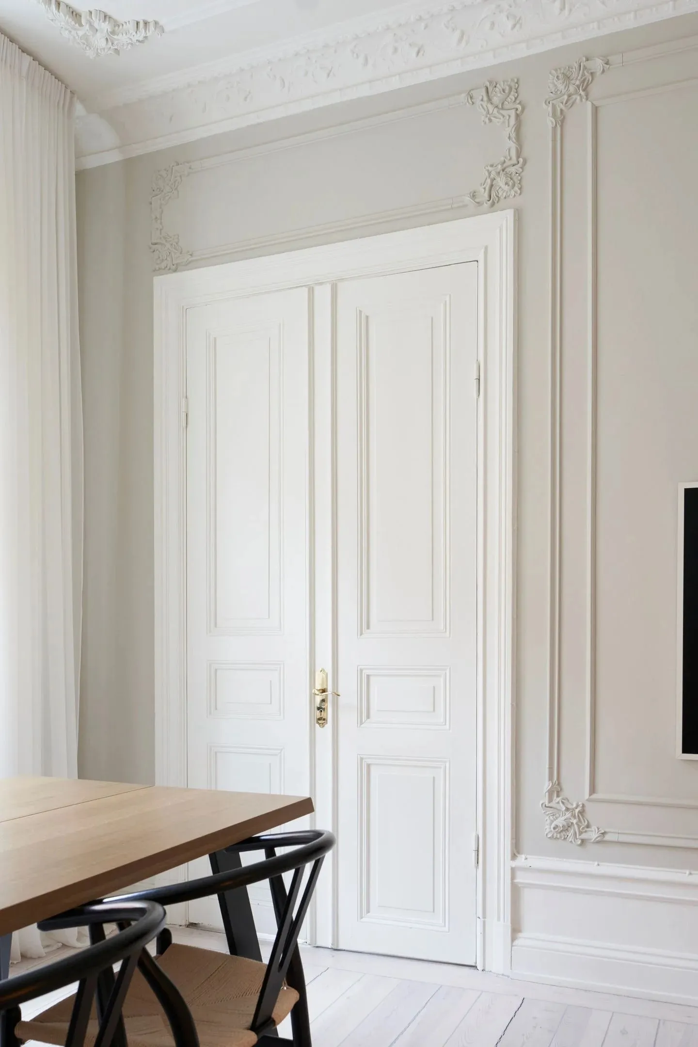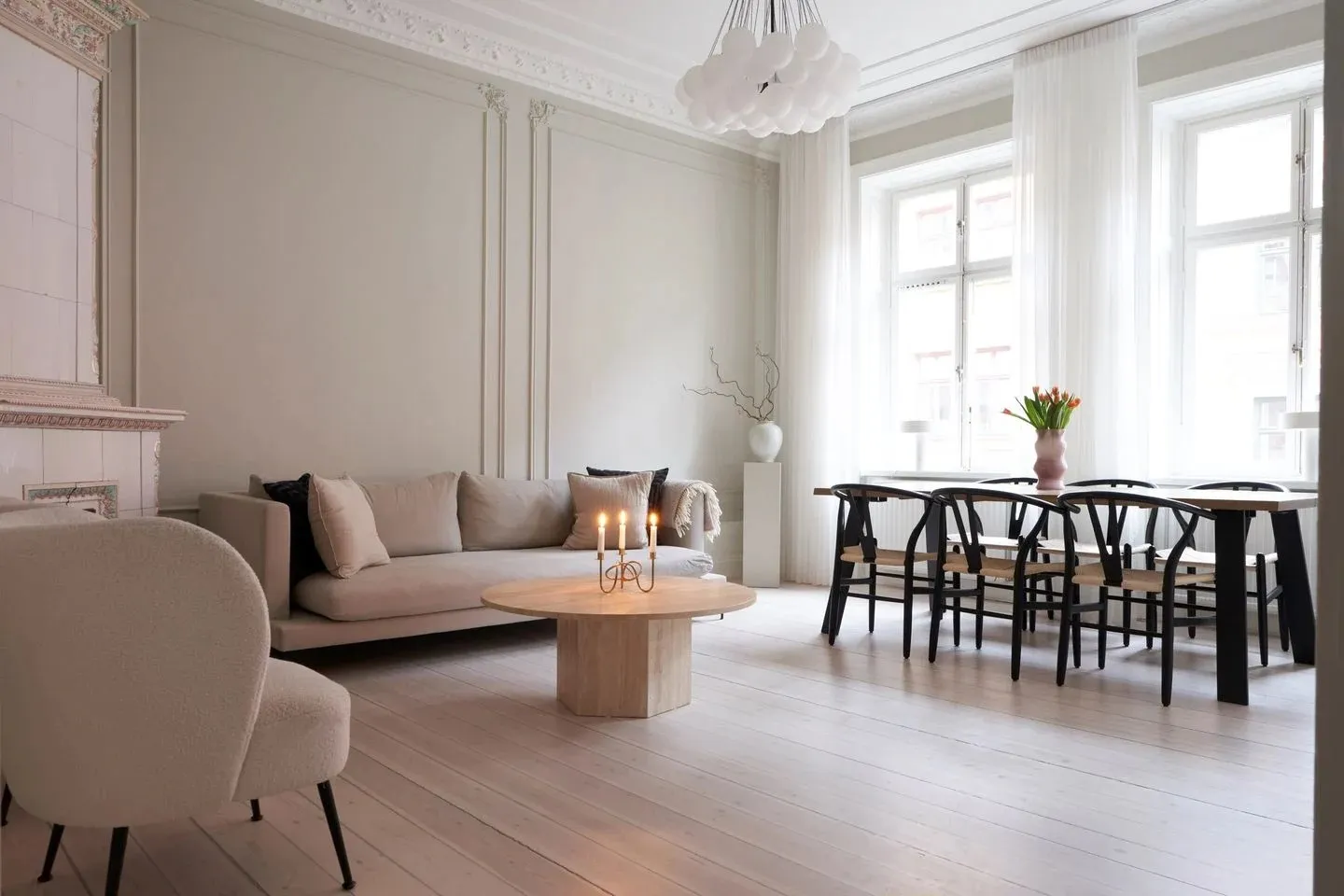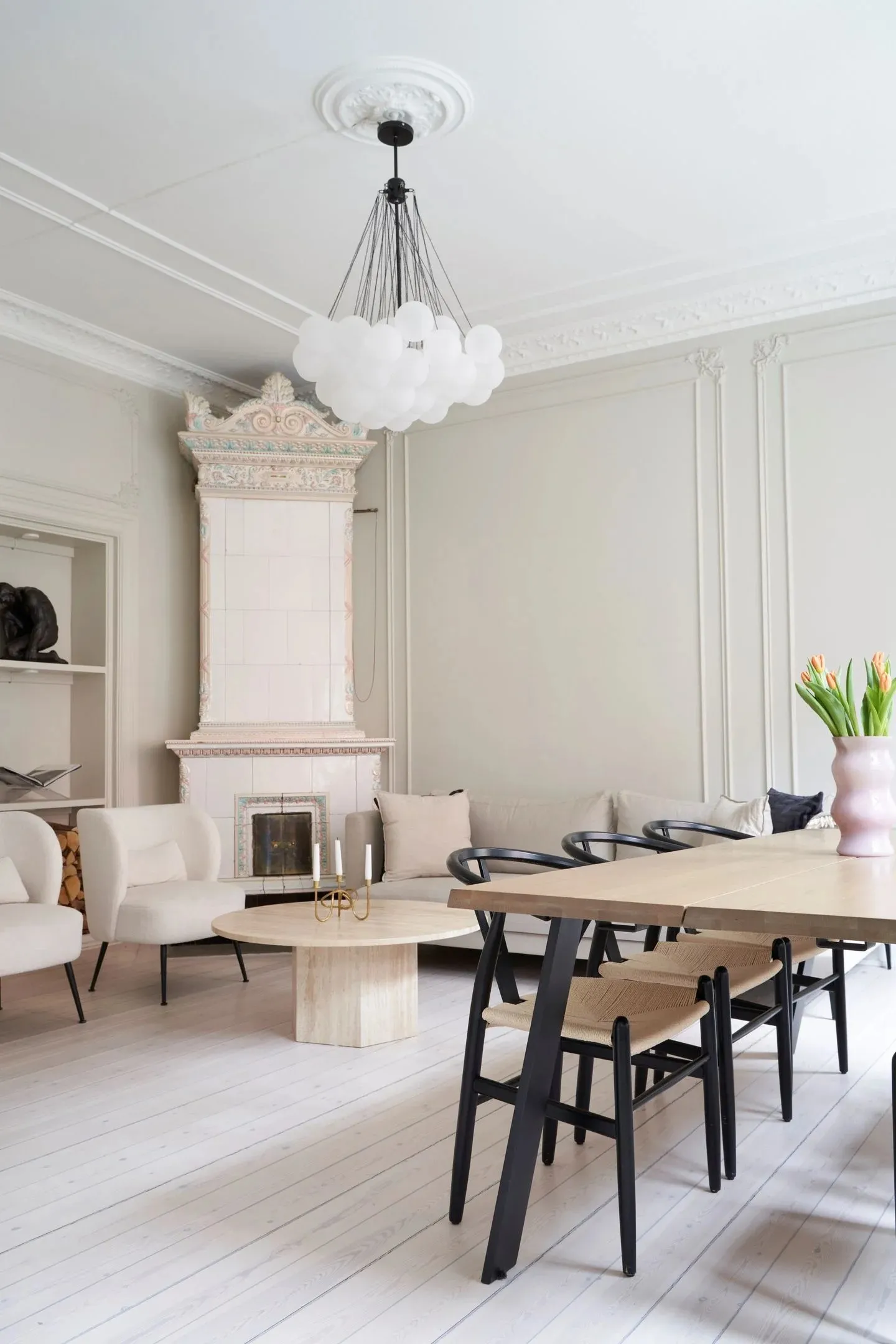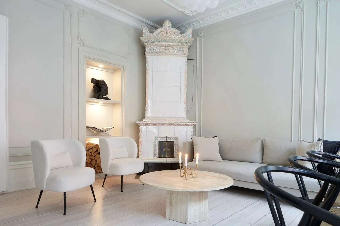 У этой шведской квартиры ярко выраженная классическая основа в виде элегантных настенных молдингов и лепнины, которые украшают комнаты с высокими потолками, огромными окнами и старинным печкам.