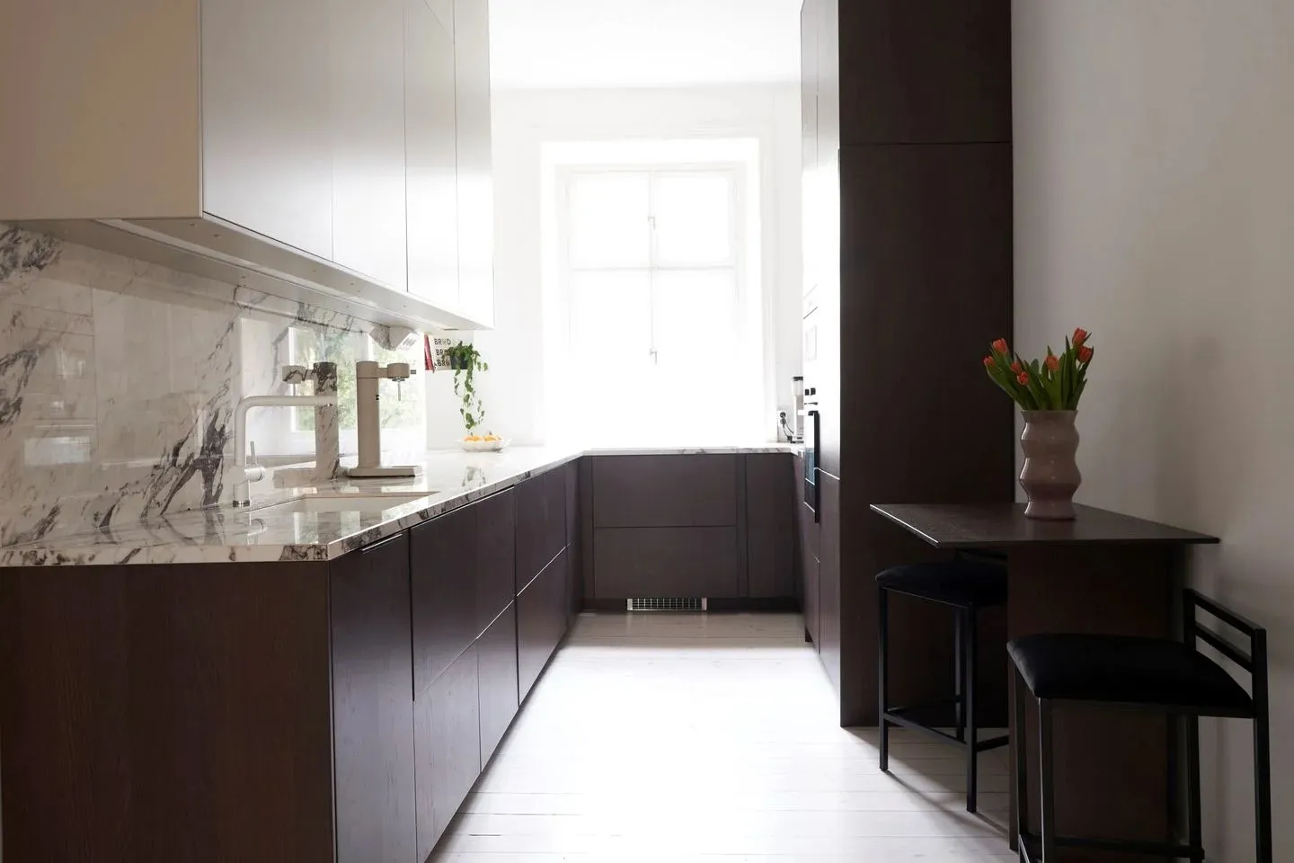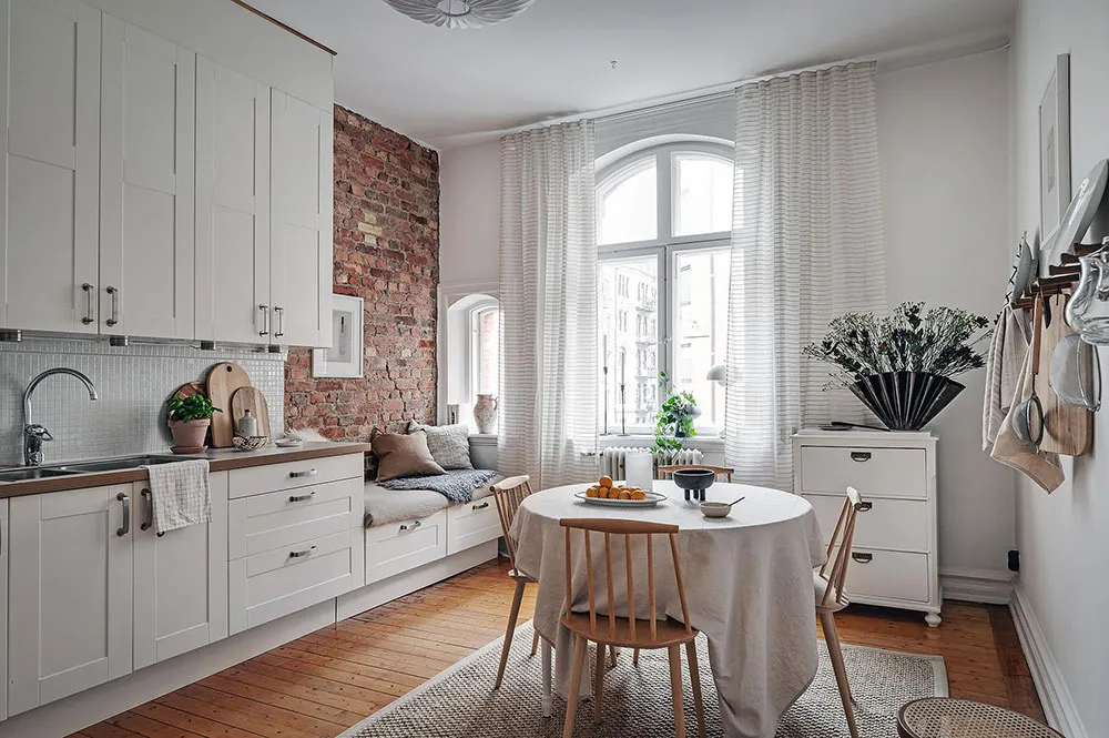 Мягкий декор и фрагменты кирпичной стены на кухне: небольшая квартира в Гетеборге (46 кв. м)