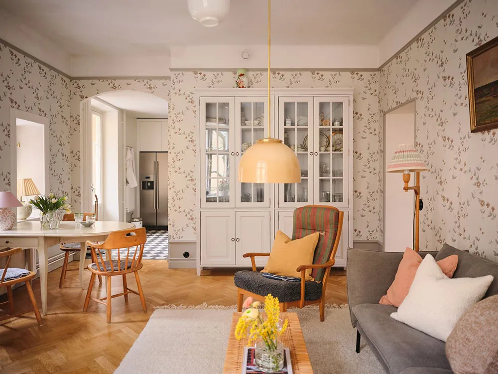 Царство цветочных обоев в дизайне шведской квартиры с мансардой
