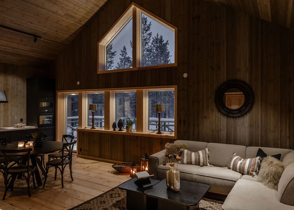 Уютный деревянный домик в заснеженном лесу в Швеции