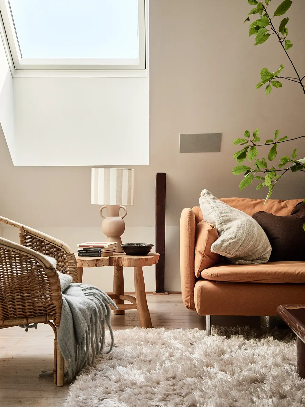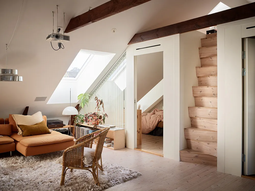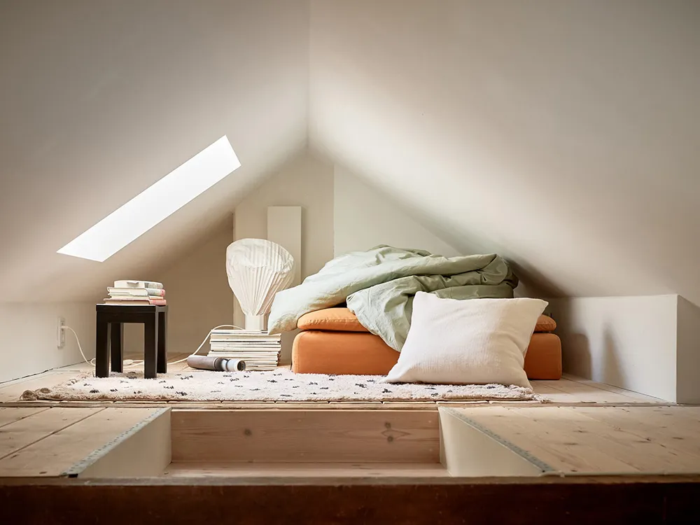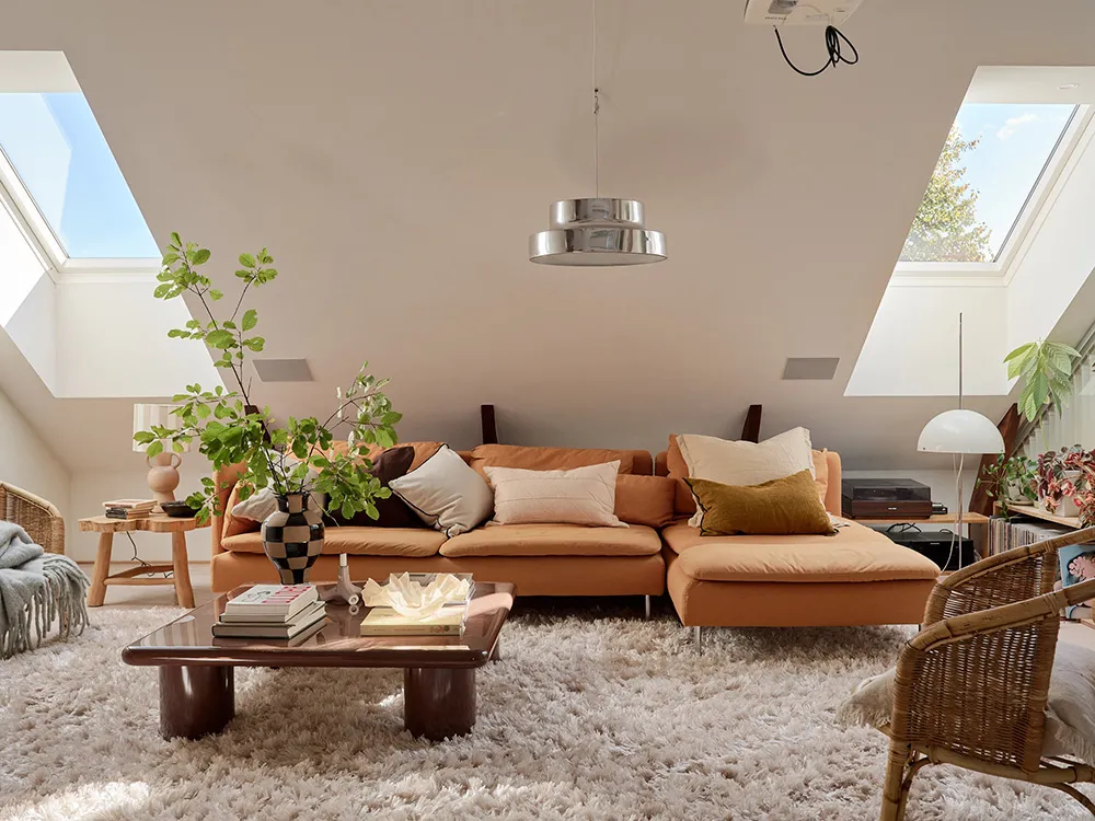 Солнечная мансарда в Швеции с рыжим диваном и спальней под крышей (68 кв. м)
