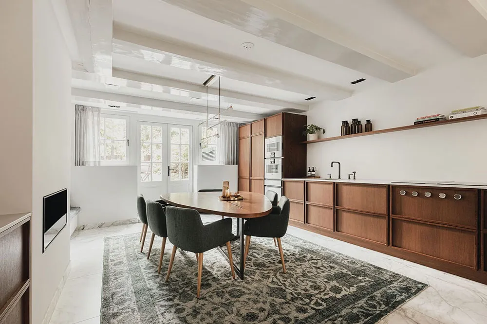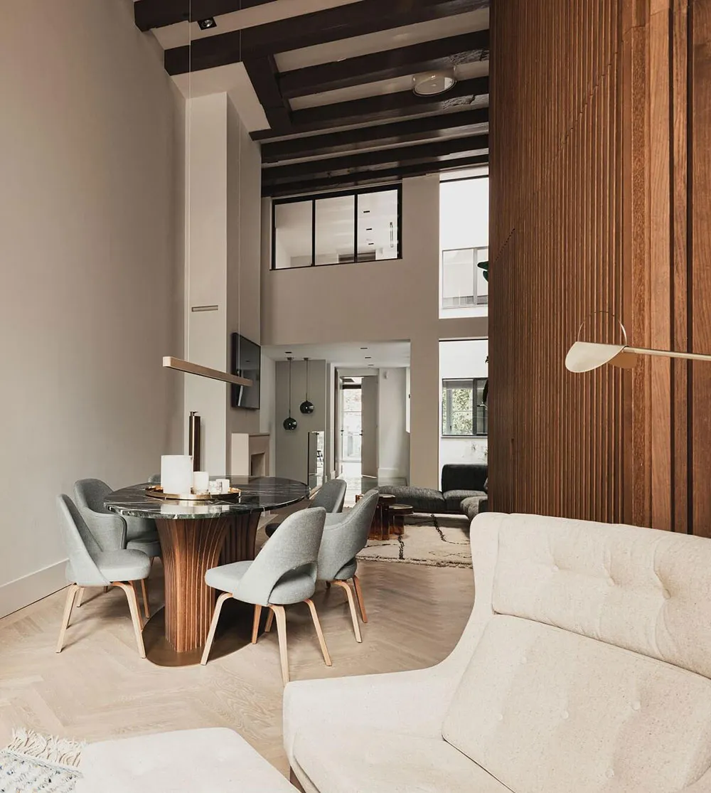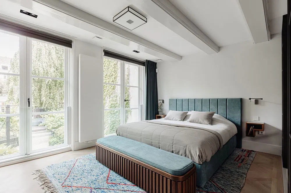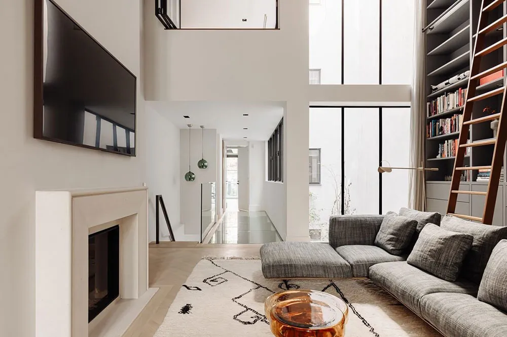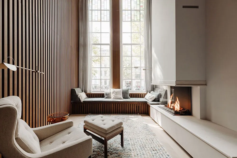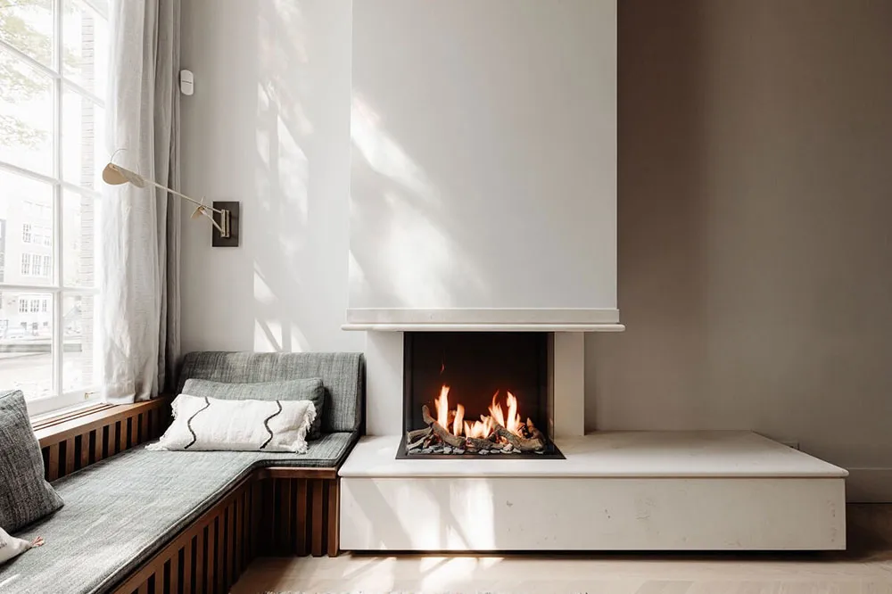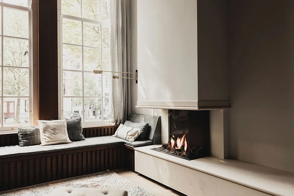 Современный дизайн дома на канале в Амстердаме со вторым светом и камином