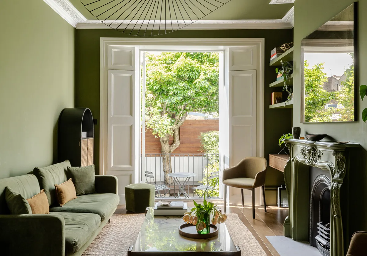 Современный интерьер викторианской квартиры в Лондоне с зелёной гостиной