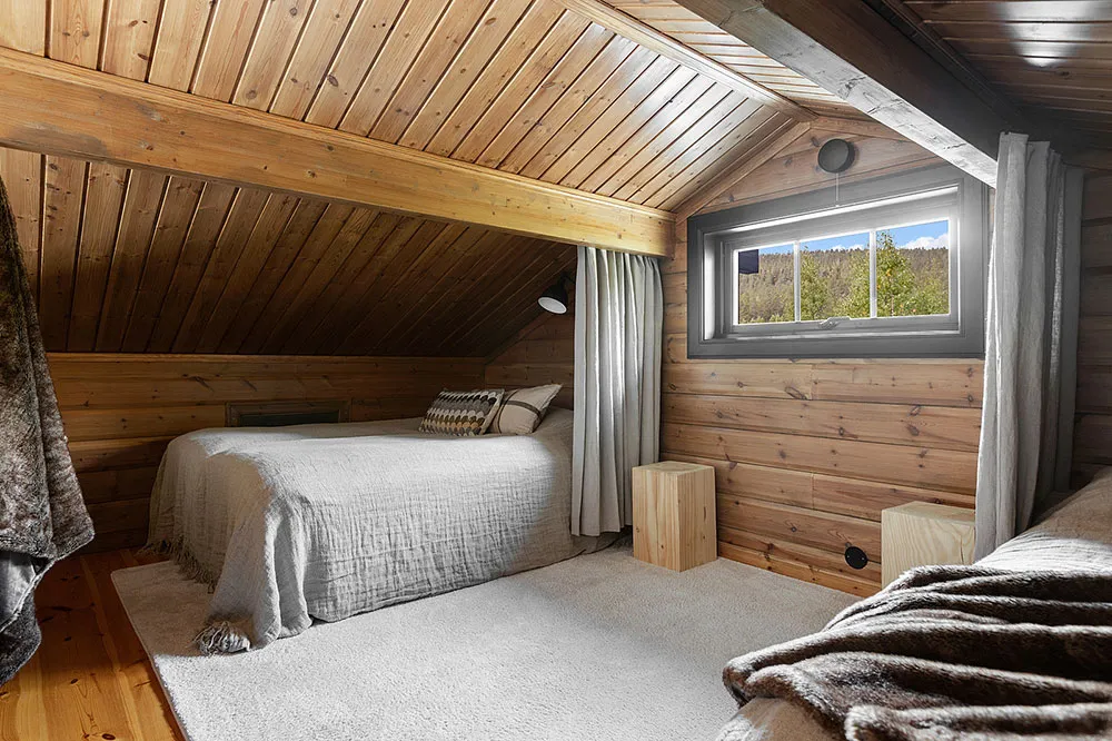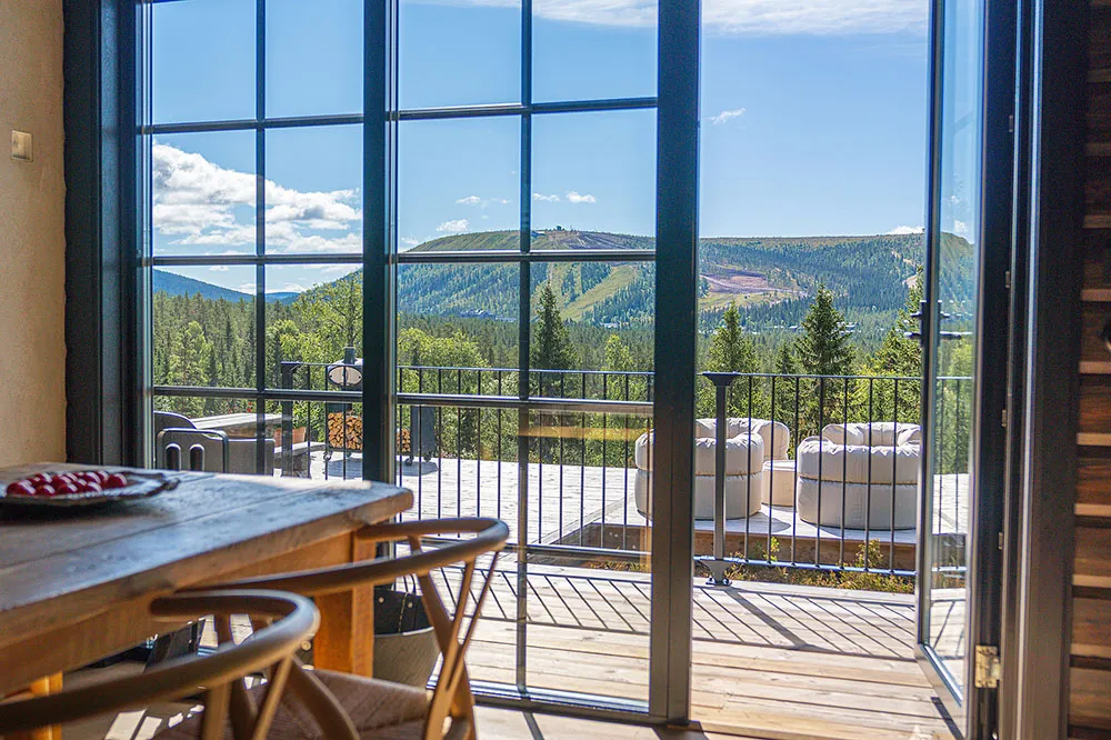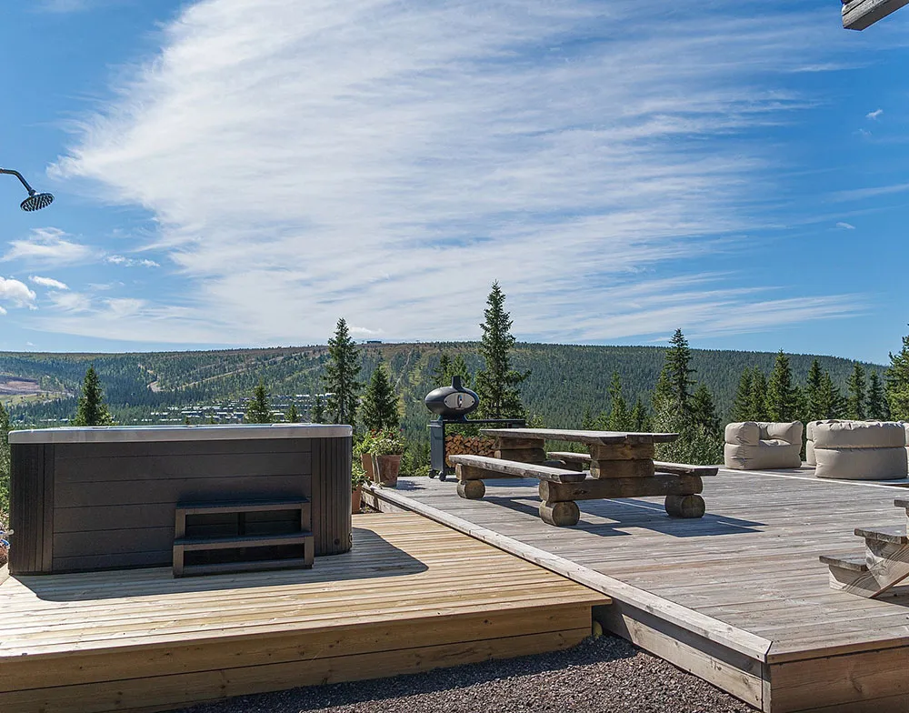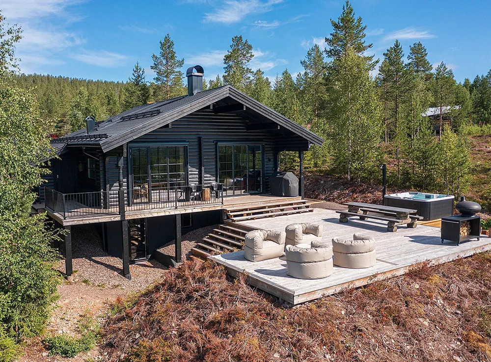 Это горное шале в Швеции имеет традиционный скандинавский фасад черного цвета с двускатной крышей и огромную видовую террасу с мебелью, барбекю и даже джакузи.