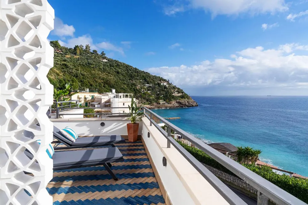Этот маленький пляжный домик на юге Италии размером с квартиру — его общая площадь всего 40 кв. м, но зато есть терраса с замечательными видами.