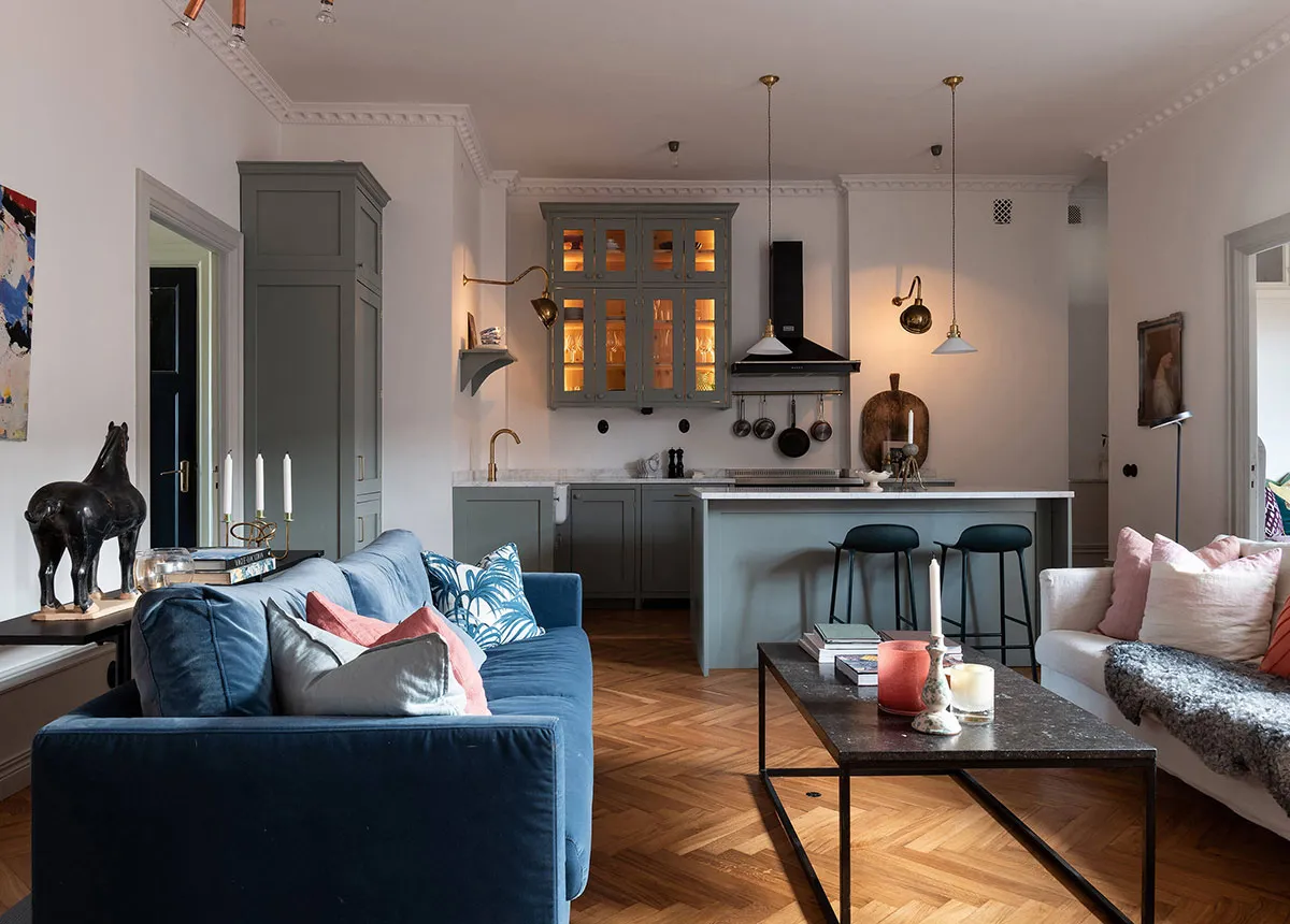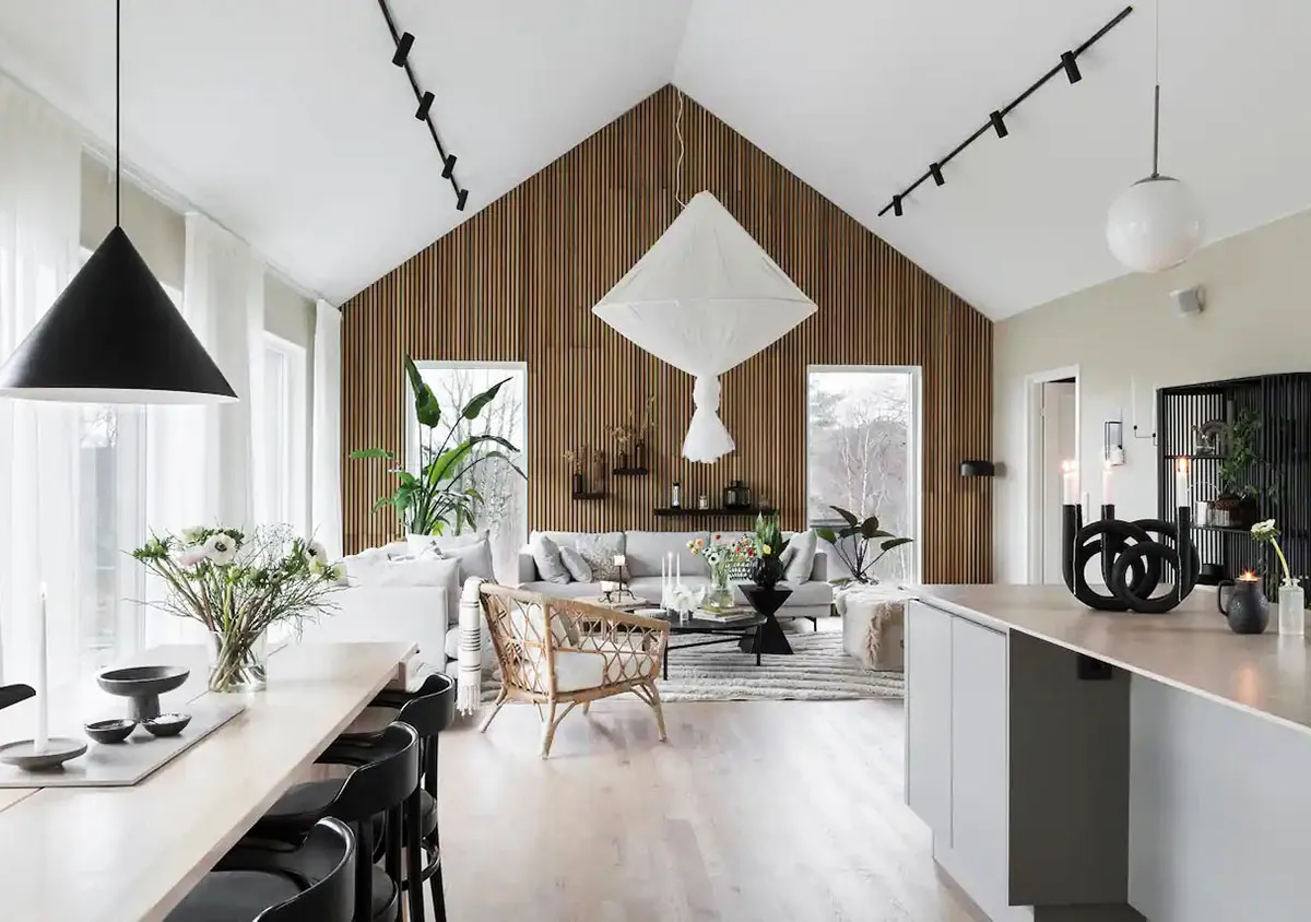 Красивый скандинавский интерьер с необычной планировкой и приятными цветовыми акцентами