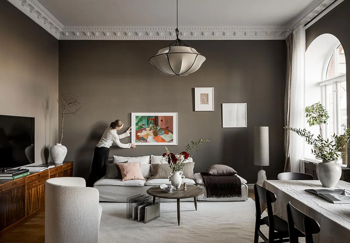Красивая скандинавская квартира с тёмными стенами и высокими потолками (77 кв. м)