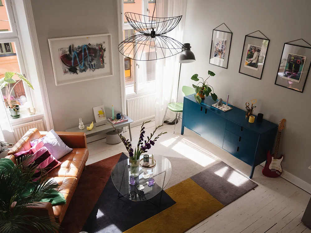 Маленькая шведская квартира с красочной мебелью и антресолью (32 кв. м)