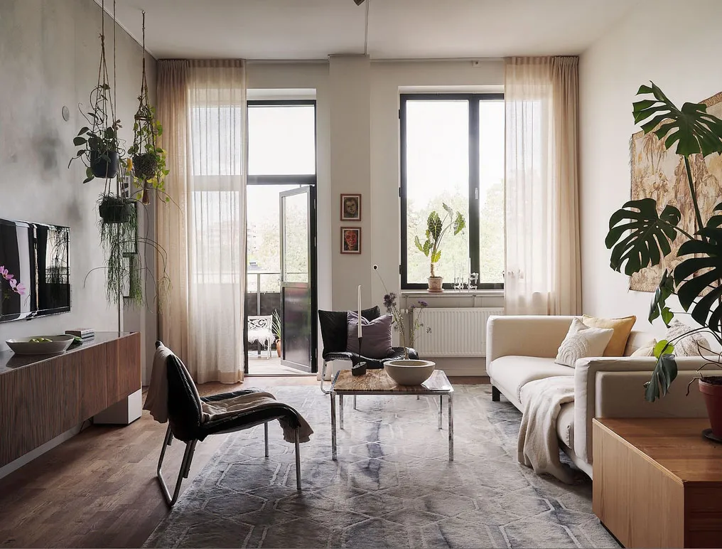 Живые растения, штукатурка на стенах и черная спальня: живой лофт в Стокгольме