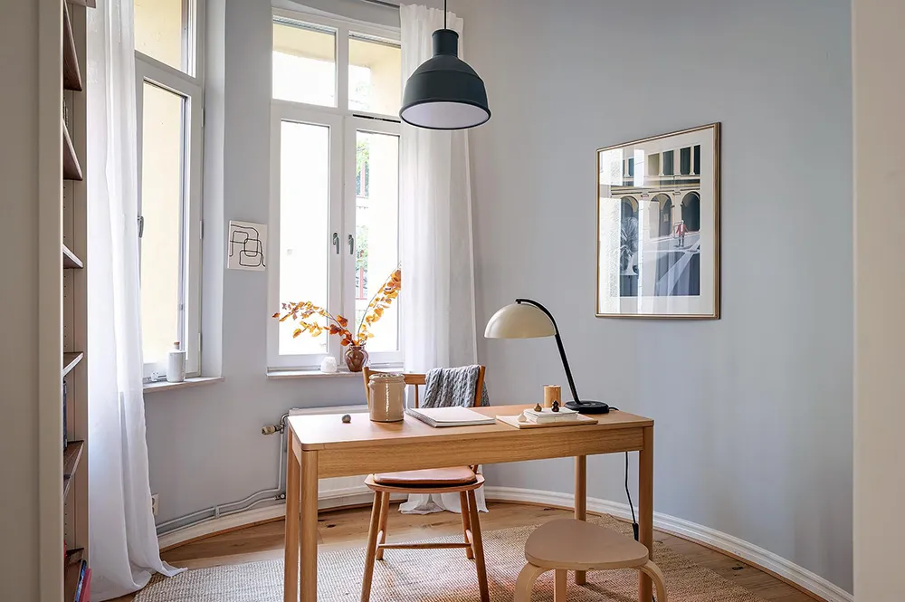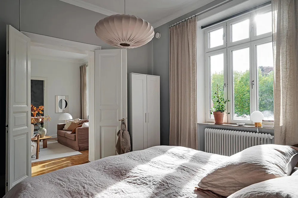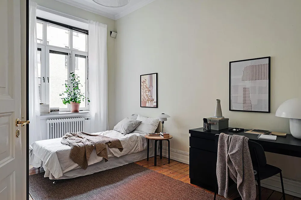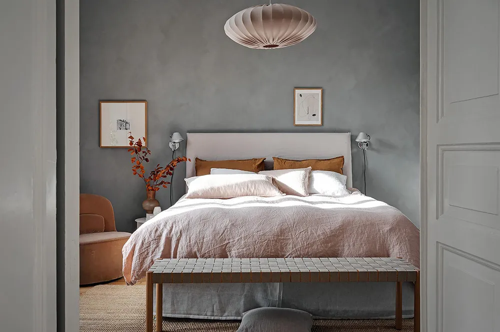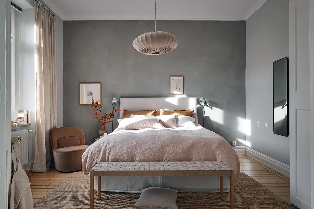 В некоторых комнатах этой шведской квартиры мы можем видеть тёмно-серую штукатурку на стенах, которая смотрится контрастно на фоне в целом очень светлого интерьера.