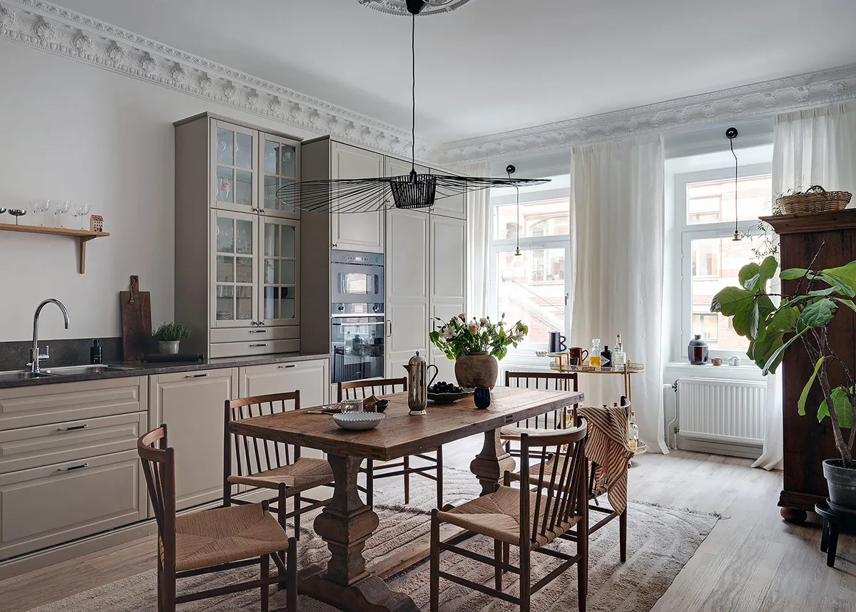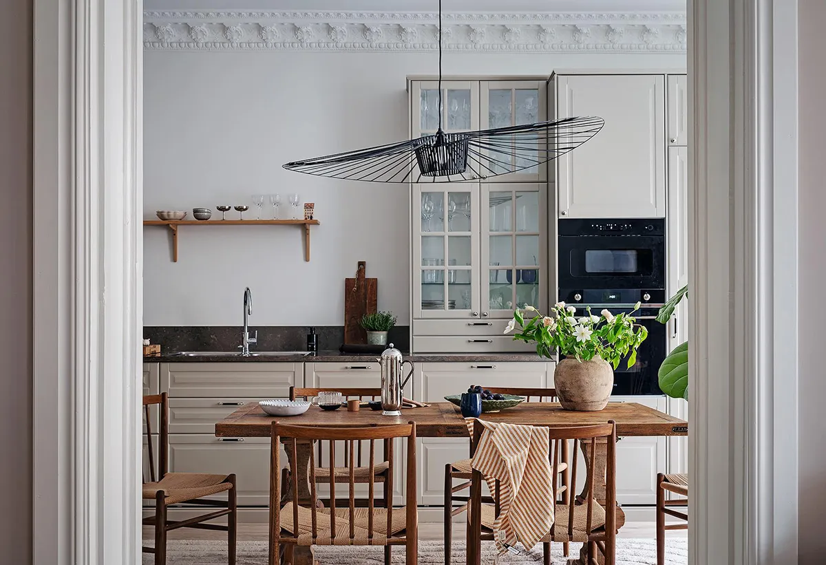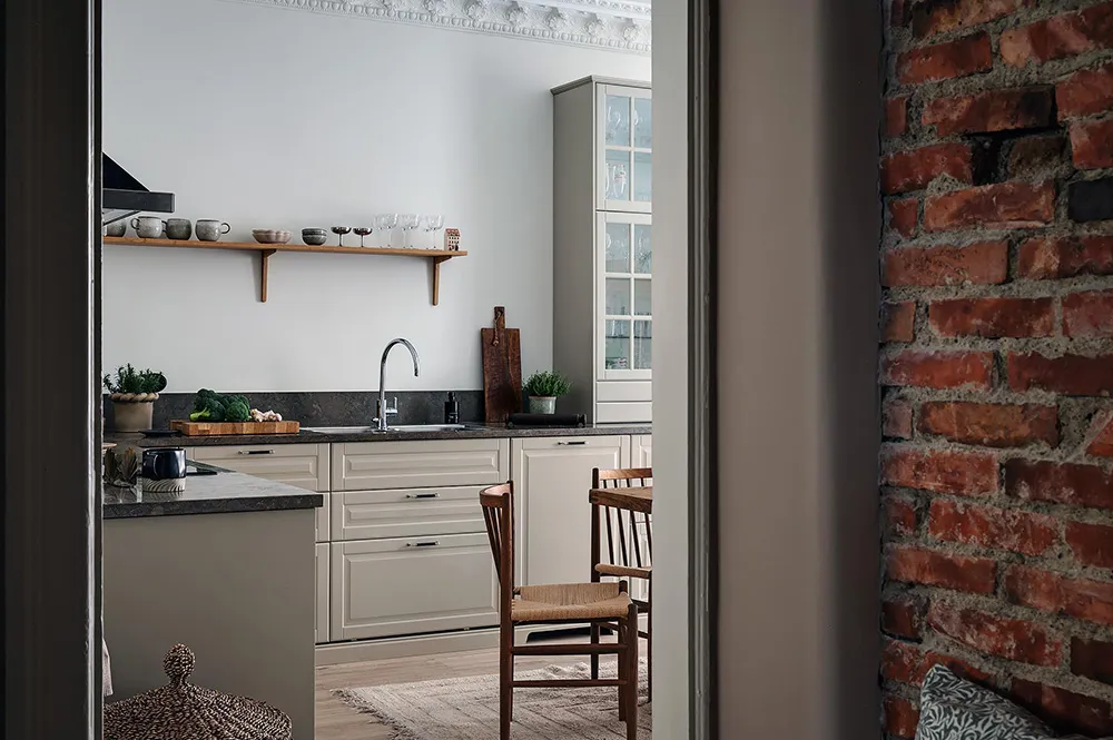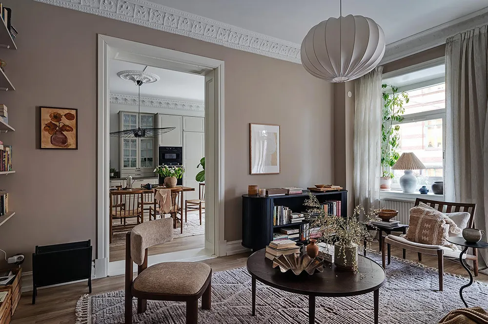 В этой шведской квартире мы насчитали несколько оттенков бежевого — от светлого и почти нейтрального на кухне до насыщенного и почти коричневого в гостиной.