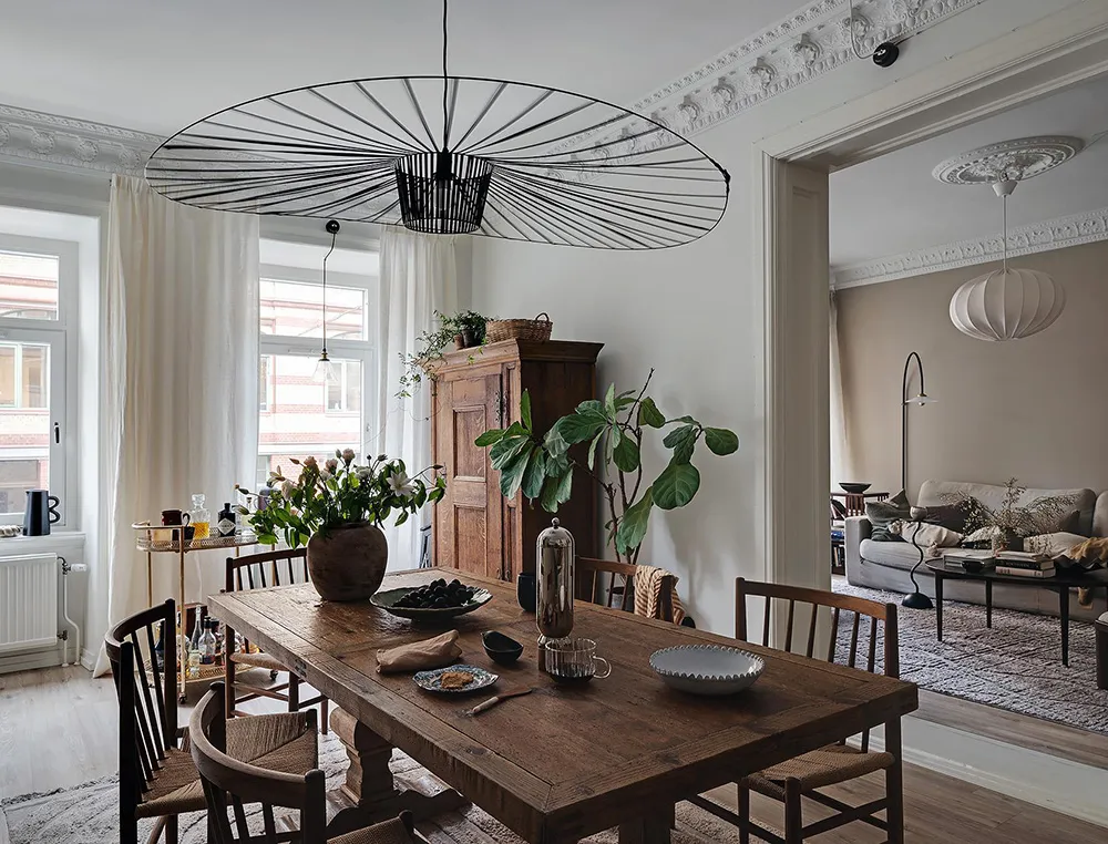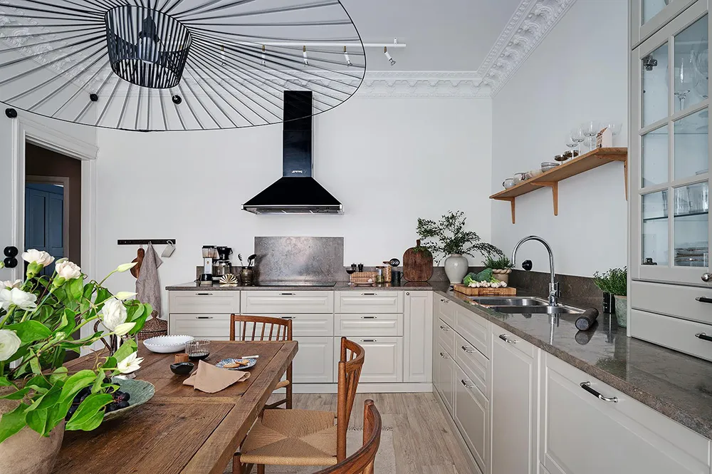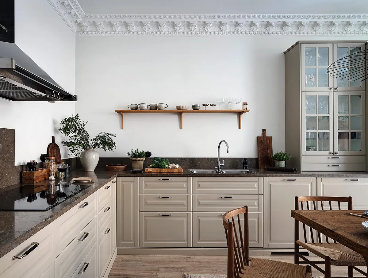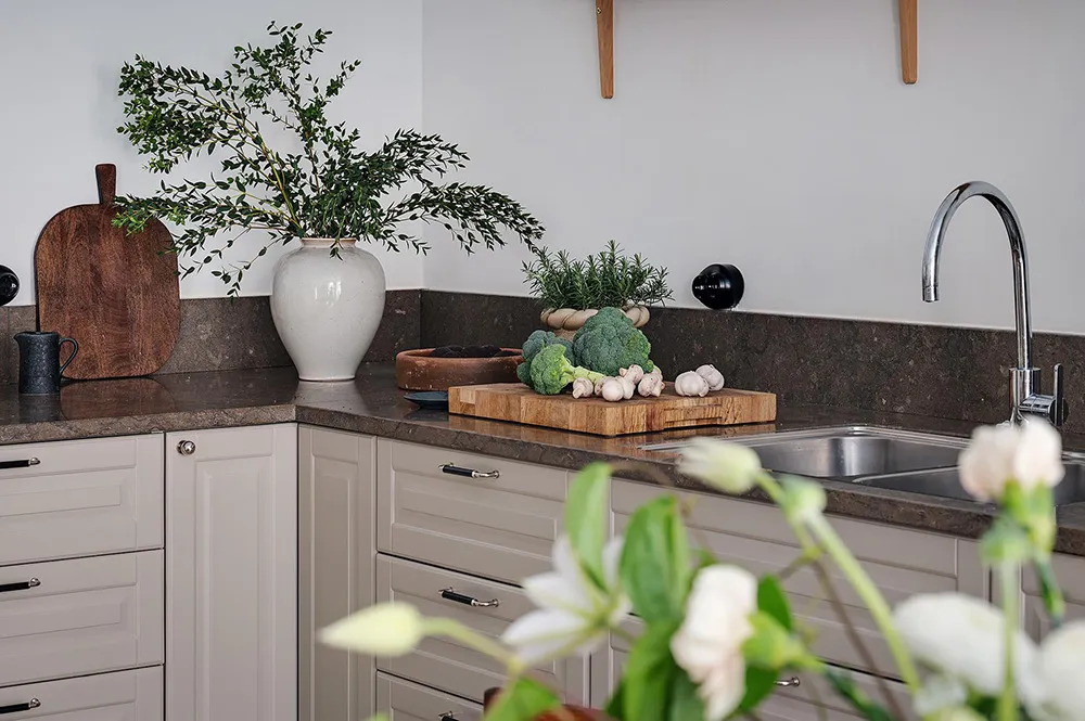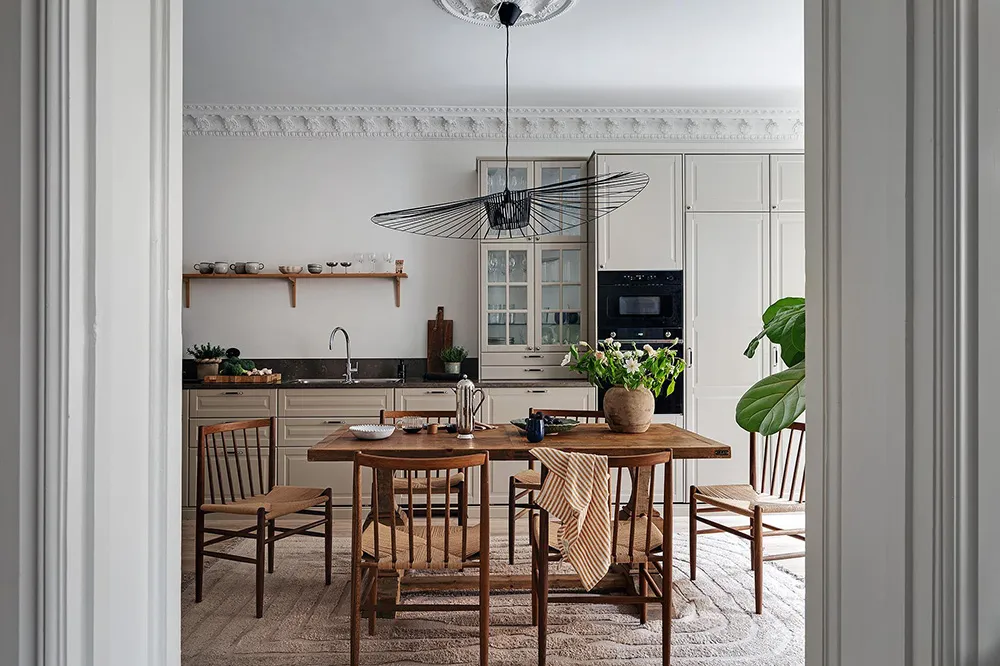 В этой шведской квартире мы насчитали несколько оттенков бежевого — от светлого и почти нейтрального на кухне до насыщенного и почти коричневого в гостиной.
