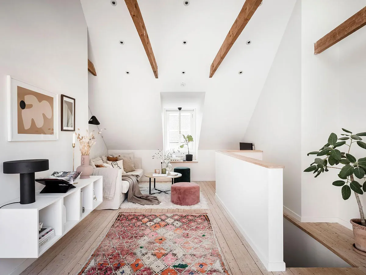 Небольшая двухэтажная квартира с балками в Швеции (55 кв. м)