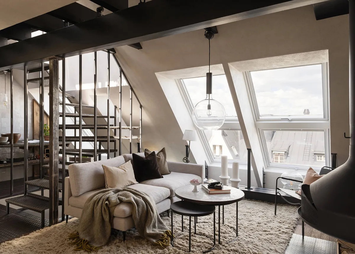 Элементы стиля рустик в дизайне скандинавской квартиры на чердаке