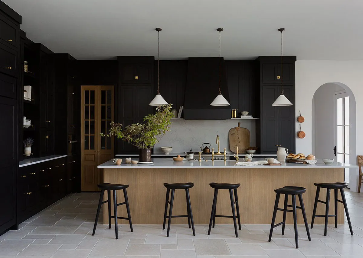 Мягкий натуральный интерьер загородного дома в США с эффектной чёрной кухней