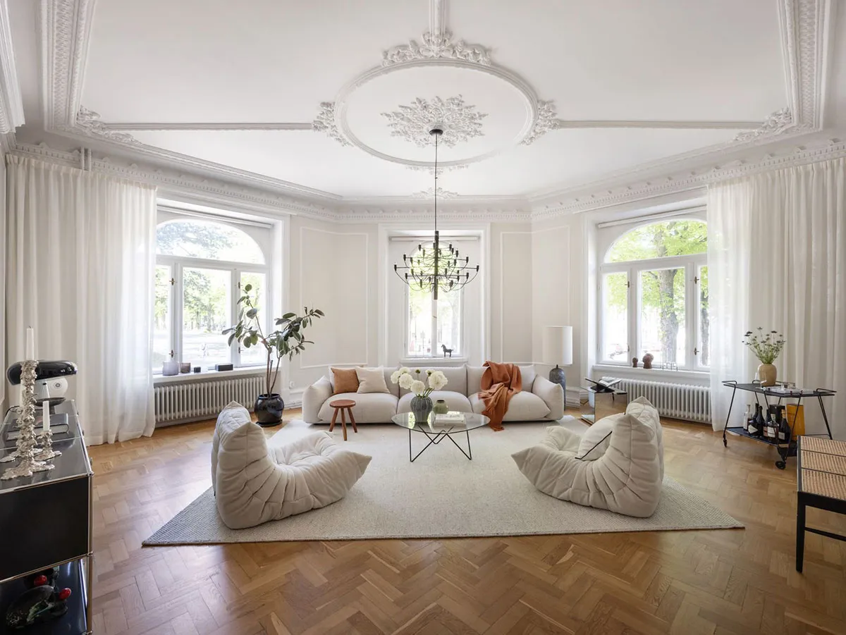 Впечатляющая лепнина и современная мебель: квартира в Стокгольме