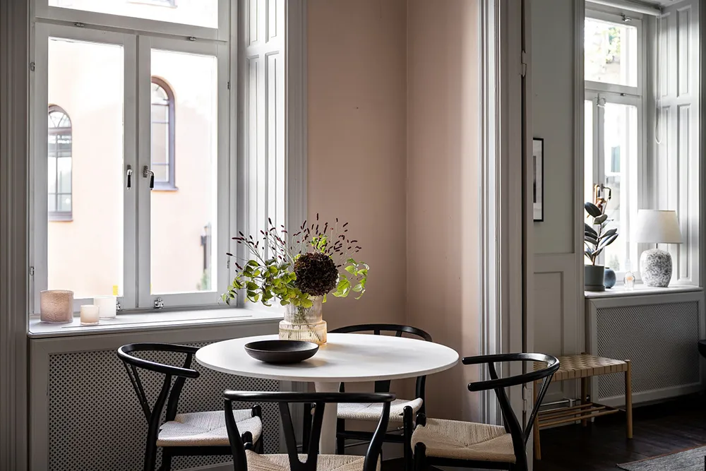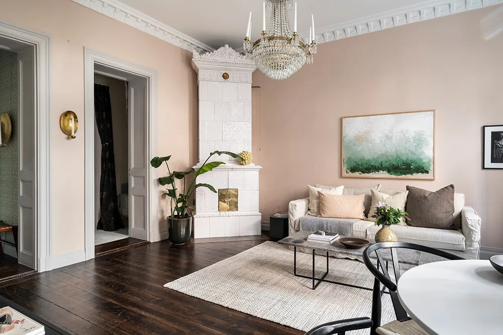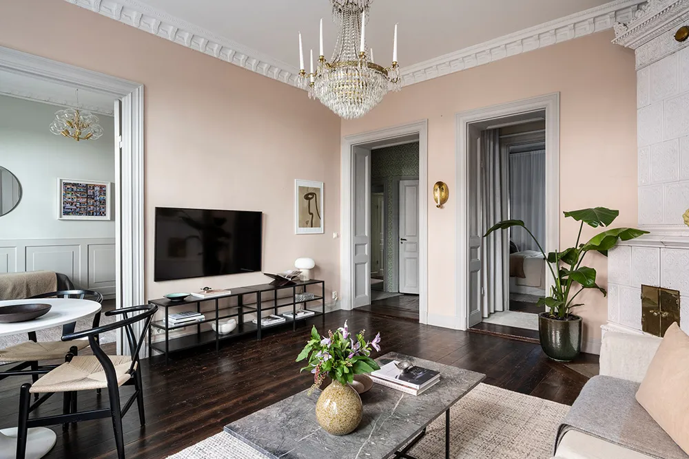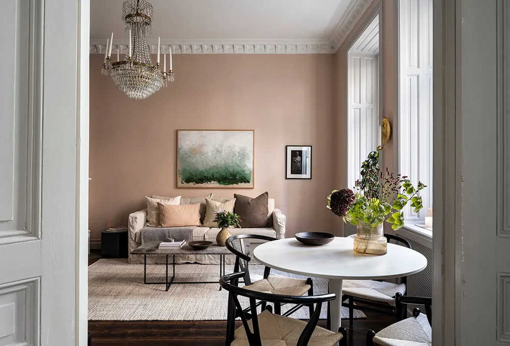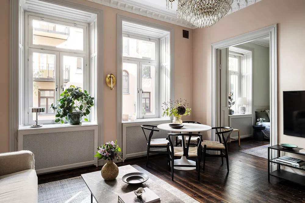 Пыльно-розовые стены и пастельно-серые двери и оконные панели — интерьер гостиной этой квартиры на первом этаже в Стокгольме отличается красивым и интересным цветовым миксом.