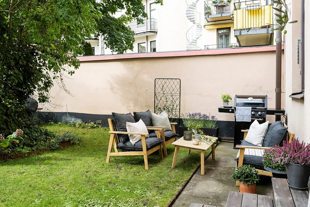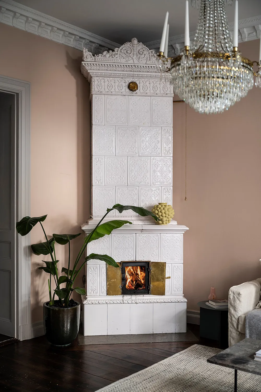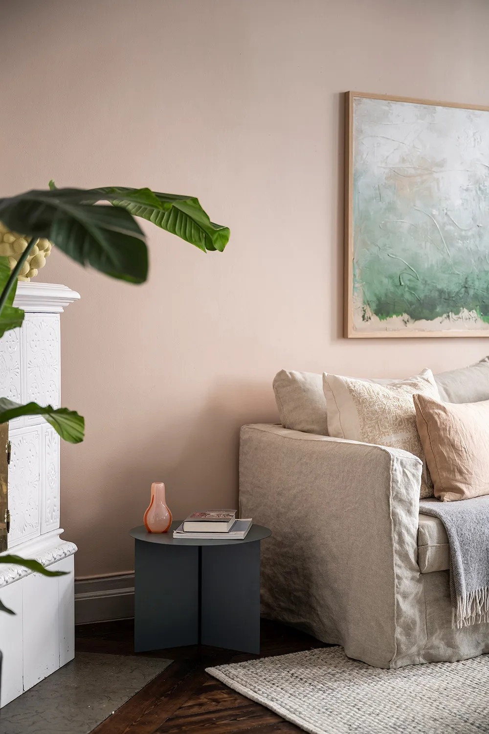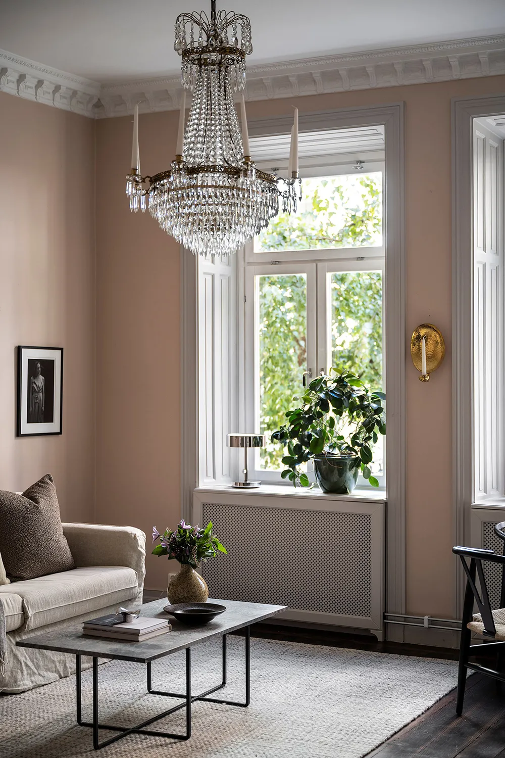 Пыльно-розовые стены и пастельно-серые двери и оконные панели — интерьер гостиной этой квартиры на первом этаже в Стокгольме отличается красивым и интересным цветовым миксом.
