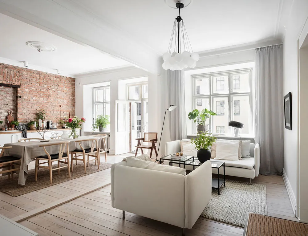 Светлый скандинавский интерьер со старинной кирпичной стеной на кухне (87 кв. м)