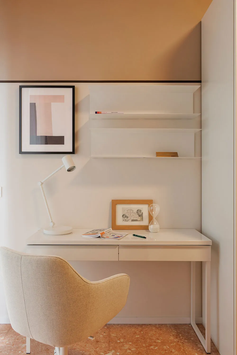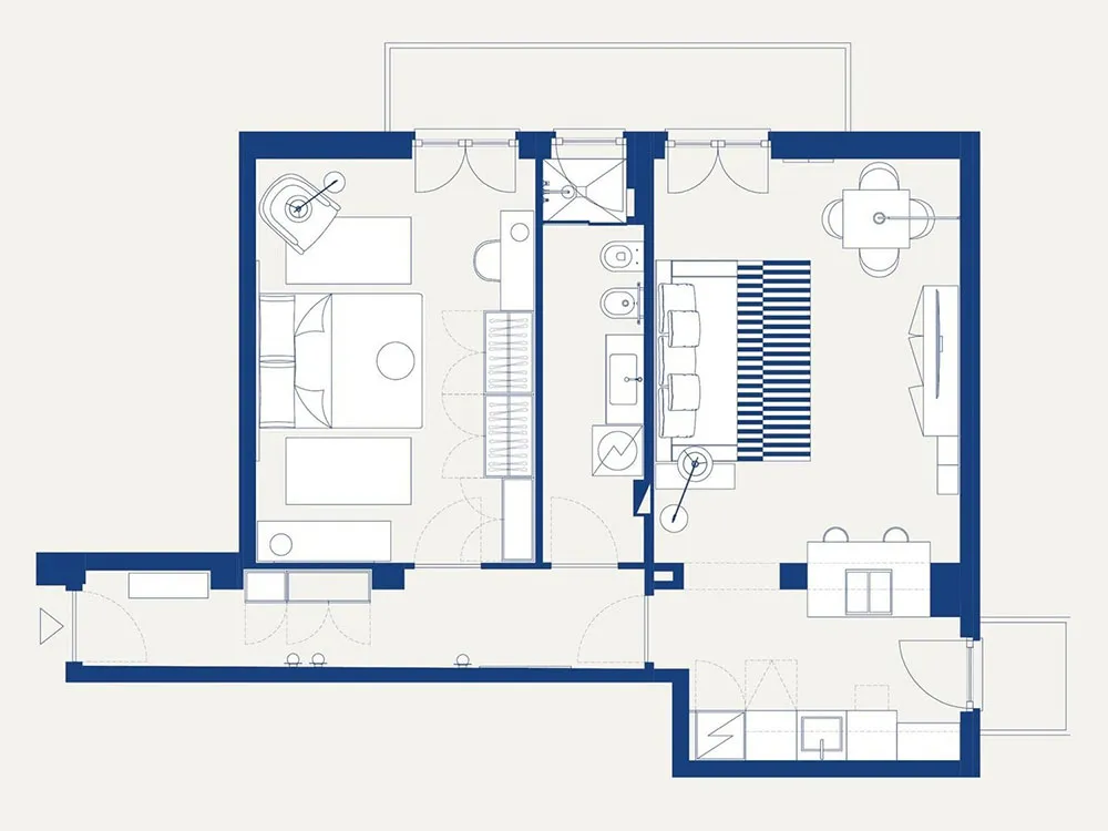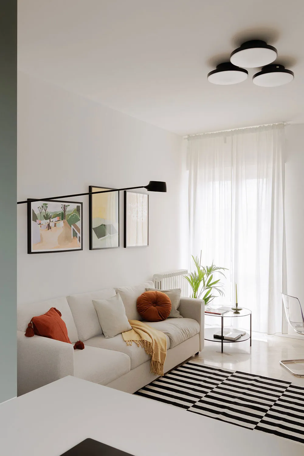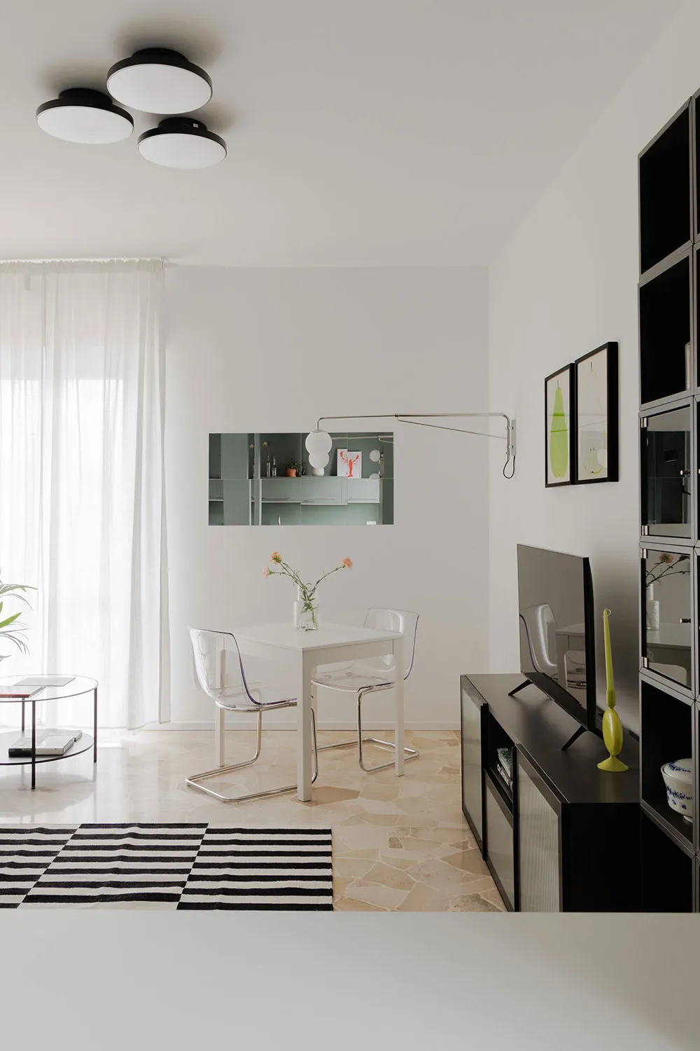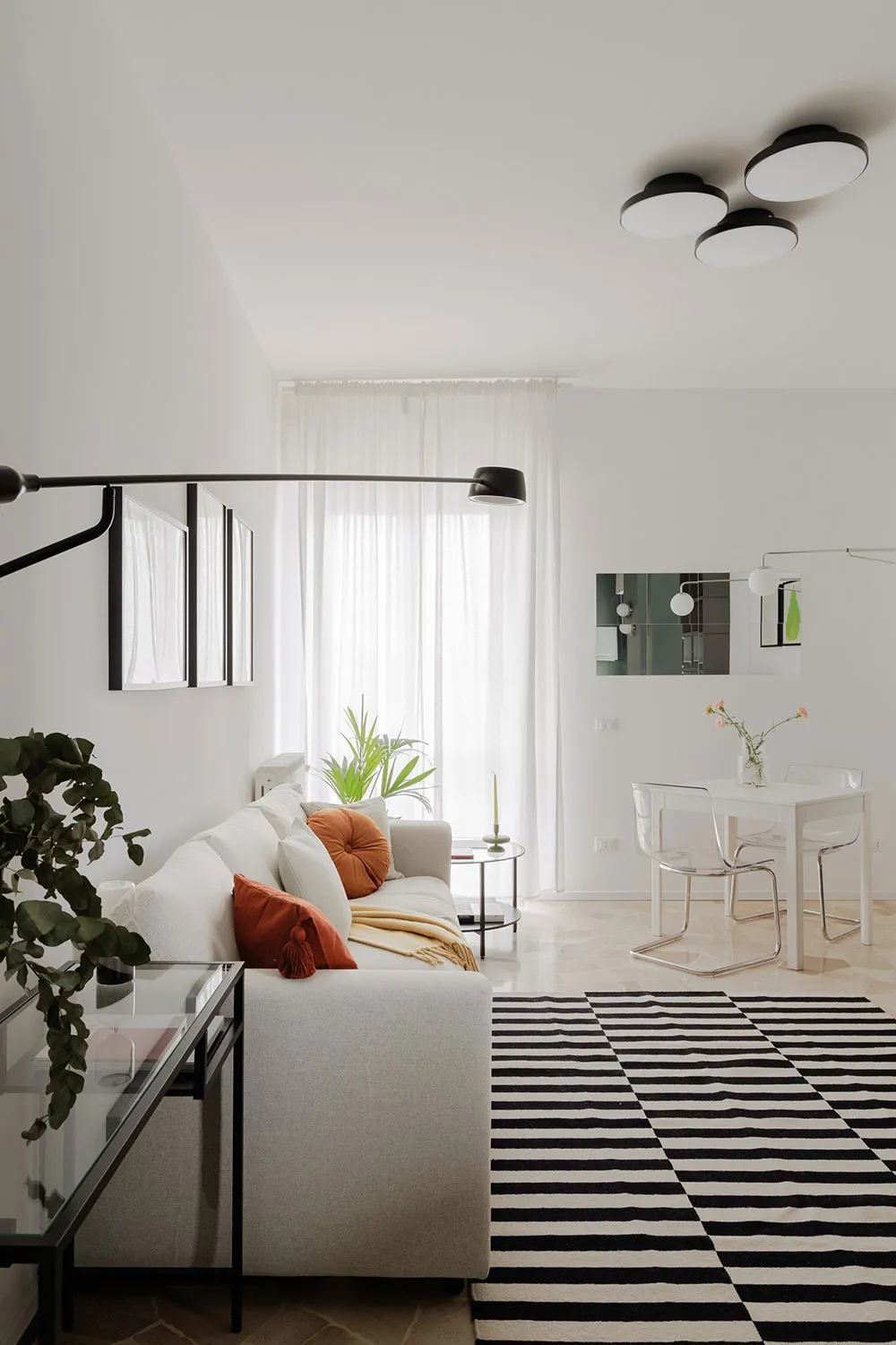 Гостиная этой небольшой миланской квартиры выполнена в белой гамме с одним лишь пёстрым пятном — полосатым ковриком.