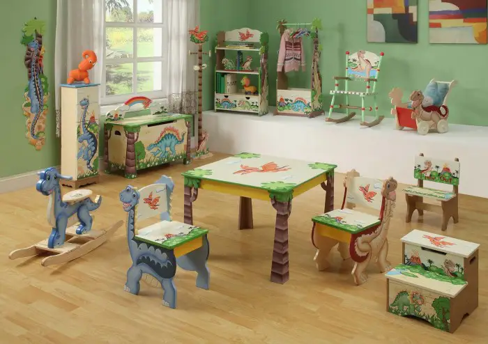 Як бачите, організувати світ динозаврів у дитячій кімнаті не складно. Крім того, окрім стін, ви можете прикрасити кімнату меблями, оформленнями у вигляді динозаврів, як на фото нижче.