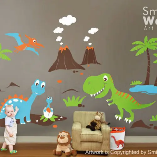 Динозаври жили серед величезних дерев, тропічних пальм, високих гор і повноводних річок. Тому стіни дитячої в стилі епохи динозаврів бажано зробити синіми, зеленими, блакитними, жовтими чи нейтральними. Можна наклеїти фотообої з зображеннями доісторичних тварин. Або ж прикрасити стіни і стельку окремими 3D-наклейками тираннозаврів або птеродактилів. Також можна намалювати сліди динозаврів.