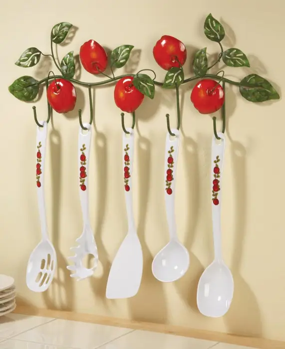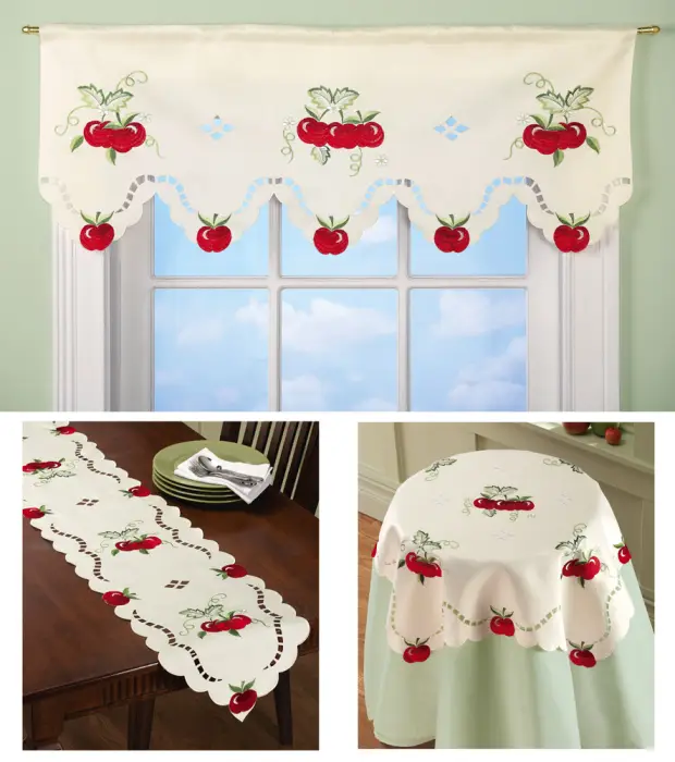 Яблука, звісно ж, дуже часто використовуються дизайнерами в інтер'єрах. Цей фрукт можна знайти на скатерті, шторах, салфетках, у вигляді полиць і настінних крючків.