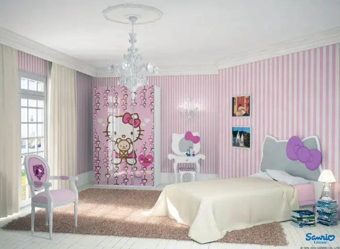 Дитячу кімнату в кішковому стилі для дівчинки найкраще робити світлою. Віддавайте перевагу ніжним спокійним відтінкам. Світло-зелені, ніжно-рожеві, фіолетові або персикові кольори будуть сприяти гармонійному розвитку дівчинки.