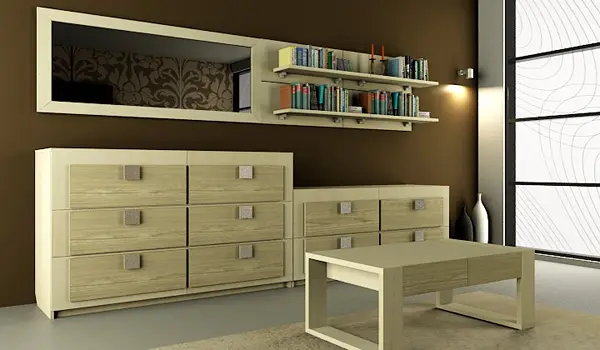 Серед шаф краще обирати модульну систему, фасади якої приховують невеликі полиці. Прийнятна низька тумба під телевізор. Але всі елементи меблів мають бути без надмірності: допустимі рівні матові, бліскучі або дзеркальні поверхні, використання скла.
