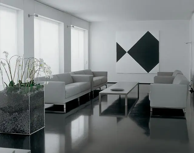 У облицюванні підлоги, стелі, стін домінує однотонність. Допустима природна забарвлення, наприклад, дерев'яний ламінат на підлозі з відрисунком, що імітує дерево, або обклеювання частини стін гостинної пробковими панелями. Компенсацією замість кольору і малюнка може бути рельєф, текстура шпалер.