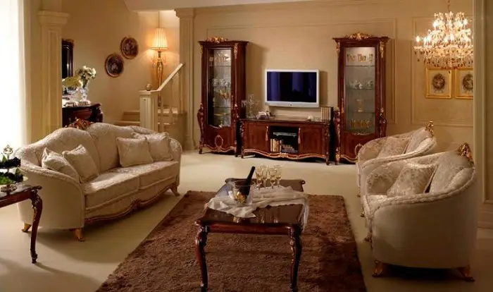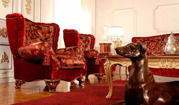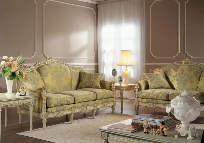 У класичній гостьовій кімнаті багато предметів меблі, вони великі, але не стоять один на одному. Диван, крісла, столик, можливо шафи і комоди вільно розміщуються у залі. М'які меблі можуть стояти біля каміна, виготовленого з мрамору або іншого каменю.