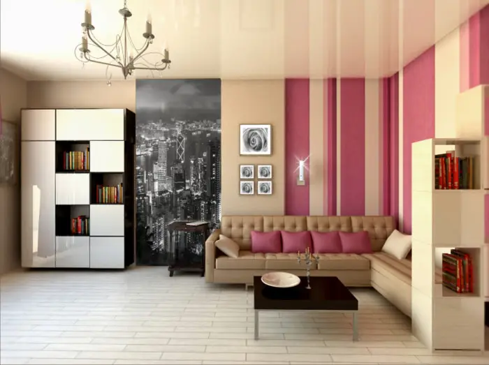Іноді явне розділення простору не потрібне: той набір предметів, який і містить інтер'єр кімнати, і визначає призначення кімнати. Тут окреме освітлення над диван-ліжком, пуфики, розкидані по всій кімнаті, полиці та, можливо, меблева стіна біля протилежної стіни, де знаходиться телевізор, дають логічне сприйняття завершеної картини інтер'єру.