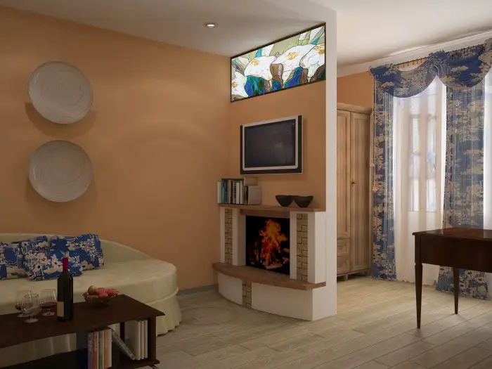 Насправді така кімната може займати центральне місце в квартирі, а це означає, що в ній знаходяться предмети загального користування, які можна використовувати як по одному, так і разом: телевізор, камін, аудіосистема, кінотеатр і т. д. У цьому випадку завдання дизайнера полягає у пошуку оптимального розміщення таких предметів.