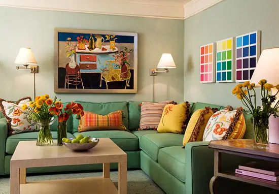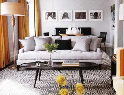 Рекомендується розмістити диван поперек кімнати – він послужить розділенням витягнутої гостьової кімнати на окремі зони, більша з яких може бути гостьовою, а менша – за диваном – робочим місцем або столовою зоною. Можна його поставити і вздовж вікна або біля довгої стіни, але тоді бажано не розміщати вздовж неї інших великих предметів меблів.