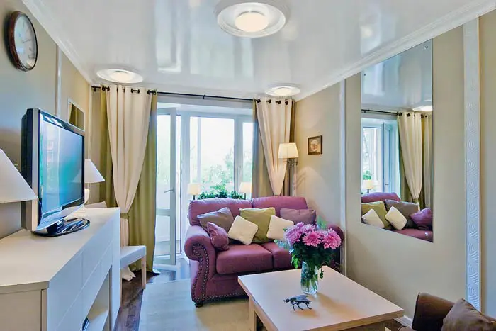 Колірна палітра вузької довгої кімнати – відповідно світла, пастельна. Це допоможе розширити приміщення. Оформлення такої гостьової кімнати повністю в темних тонах погіршить непропорційність і створить не дуже гарне враження від кімнати.
