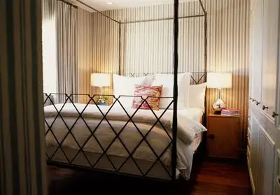 - Рідкий рисунок сприяє розширенню простору, горизонтальний візерунок ілюзійно витягує стіни. Найкраще для маленької спальні – матовий тиснений рисунок, однотонні фактурні обої світлих молочних, бежевих, золотистих, піщаних, зелених, оливкових відтінків.