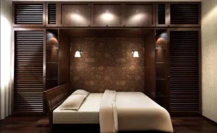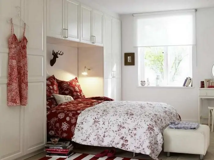 Якщо є можливість, краще встановити шафу поза спальні, якщо немає – встановити її в ниші або придбати компактну шафу-купе від стелі до підлоги.