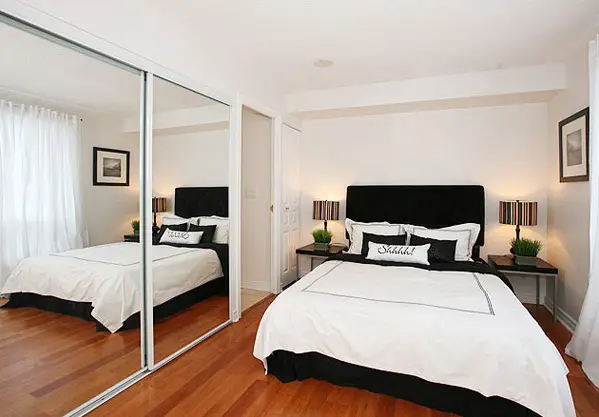 - Один із прийомів, які розширюють простір — використання дзеркал. Не кожен вирішиться застосувати їх через хрупкість, складність монтажу і несподіване відчуття постійного відображення себе в дзеркалах. Однак навіть у спальні повністю придатний дзеркальний ефект. Наприклад, блискучий підвісний стельний ефект через свої відблиски збільшить висоту спальні. Зеркальні дверцята шафи-купе, двері або перегородки розширять простір.