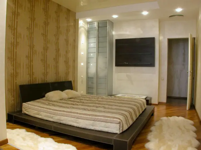 Наприклад, концепція дизайнера, який виконав цю роботу, передбачає стельу з гіпсокартону з використанням додаткових точкових ліхтариків. Крім цього, використання ліхтариків на стіні поруч із ліжком і усвідомлене затемнення головки створює ефект розширення простору з будь-якої точки в кімнаті.